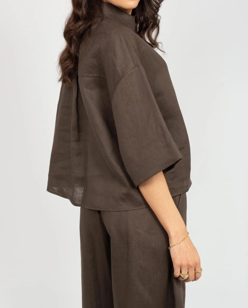 Itāļu modes zīmola MM by Max Mara tumši brūna plata, saīsināta piegriezuma kreklveida blūze sievietēm. Izgatavota no viegla linu auduma. Papildināta ar slēptu pogu aizdari, pusgarām piedurknēm un ielocēm mugurpusē.