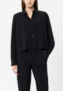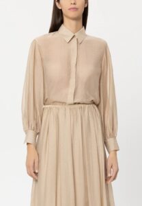 Vācu premium klases apģērbu zīmola Luisa Cerano koķeta sieviešu kreklveida blūze dūmakaini rozā tonī ar sarkanu lūpu dizaina apdruku. Izgatavota no viegli caurspīdīga un gaisīga viskozes auduma. Papildināta ar dekoratīvu krokojumu pie aprocēm un noapaļotiem sānu šķēlumiem.