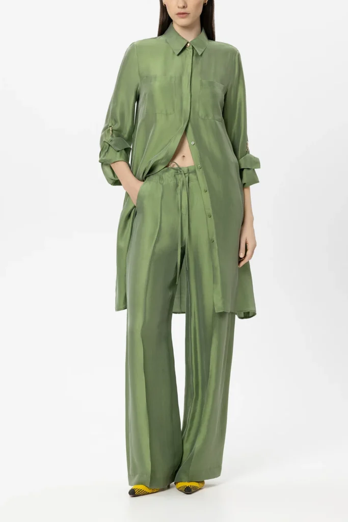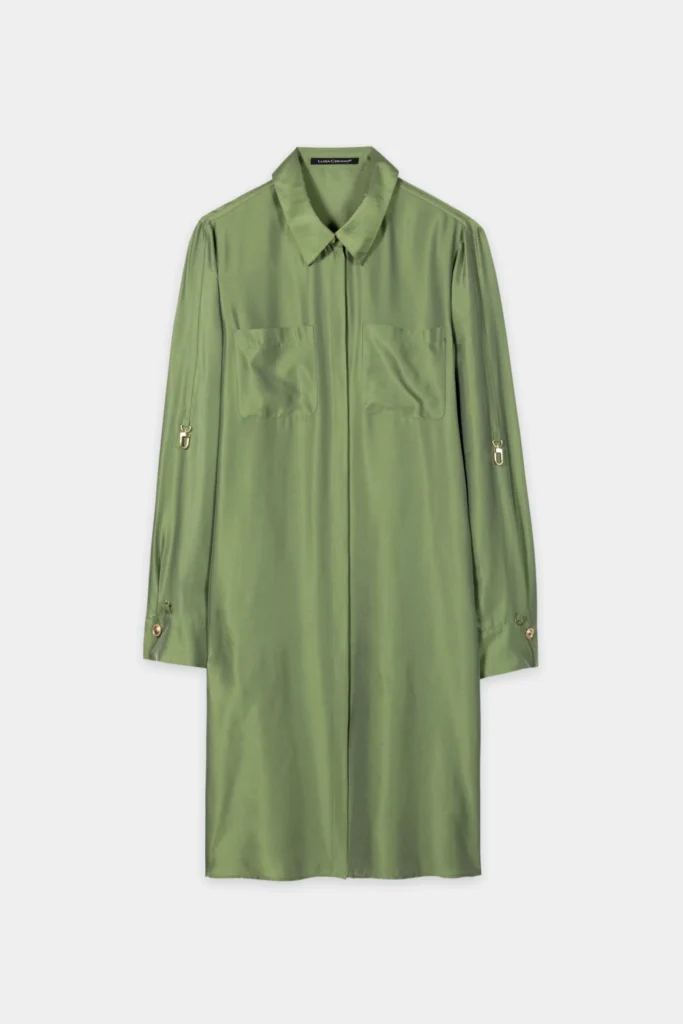 Vācu premium klases apģērbu zīmola Luisa Cerano dūmakaini zaļa viegli paplatināta piegriezuma kreklkleita ar slēptu pogu aizdari. Izgatavota no grezna viskozes un zīda materiāla ar satīna spīdumu. Papildināta ar iešūtām sānu un uzšūtām krūšu kabatām, kā arī atlokāmām piedurknēm. Akcentēta ar zelta krāsas pogām un dizaina detaļām.