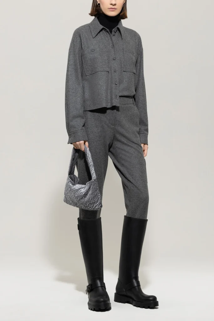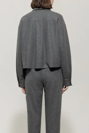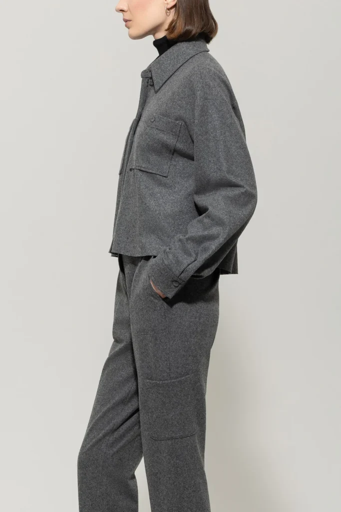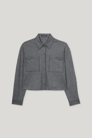 Vācu premium klases apģērbu zīmola Luisa Cerano saīsināts plata piegriezuma sieviešu krekls tumši pelēkā krāsā. Izgatavots no mīksta un elastīga vilnas maisījuma flaneļa materiāla. Papildināts ar uzšūtām krūšu kabatām.