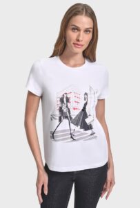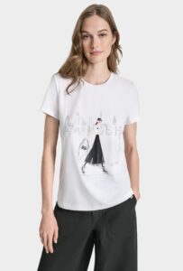 Vācu luksusa zīmola Karl Lagerfeld sieviešu T-krekls baltā krāsā ar rotaļīgu ikoniskā zīmola logotipa- Choupette attēlu un melnu logo uzdruku pie apkakles mugurpusē. Izgatavots no augstākās kvalitātes organiskās kokvilnas.