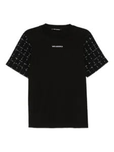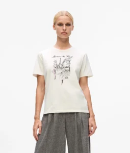 Itāļu luksusa zīmola Emporio Armani balts organiskās kokvilnas T-krekls sievietēm ar smalku, horizontālu zig-zag veida līniju rakstu un zīmola ikoniskā logotipa- ērgļa izšuvumu sarkanā krāsā.