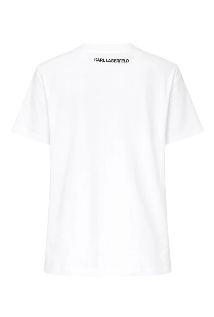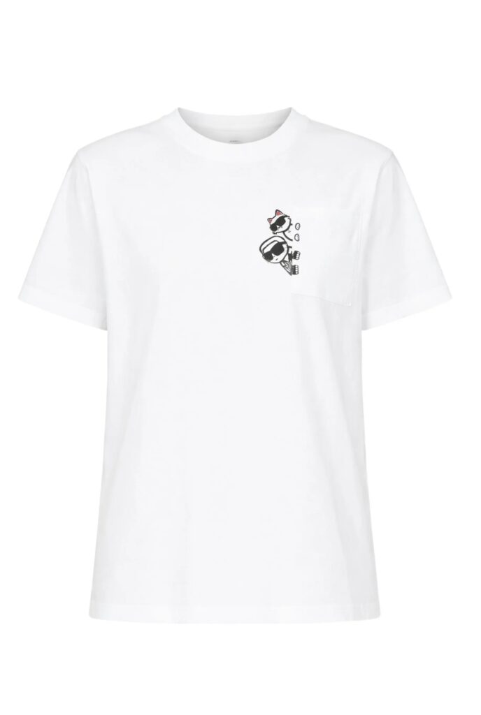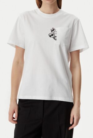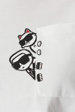 Vācu luksusa zīmola Karl Lagerfeld balts sieviešu T-krekls ar uzšūtu kabatu. Izgatavots no augstākās kvalitātes organiskās kokvilnas. Akcentēts ar amizantu Karl & Choupette zīmējumu pie krūšu kabatas un kontrastējošu logotipu pie apkakles mugurpusē.