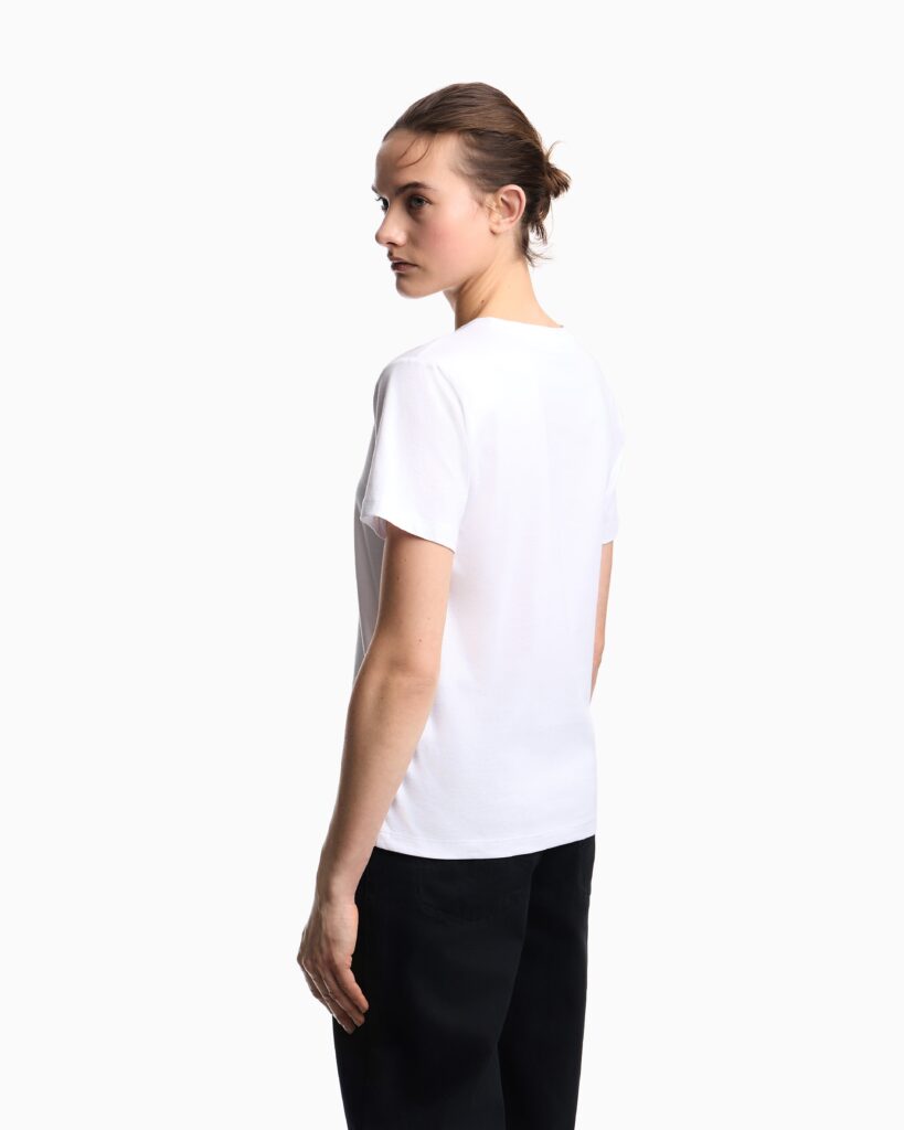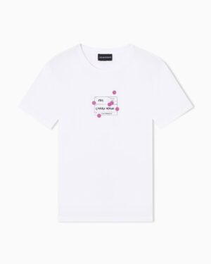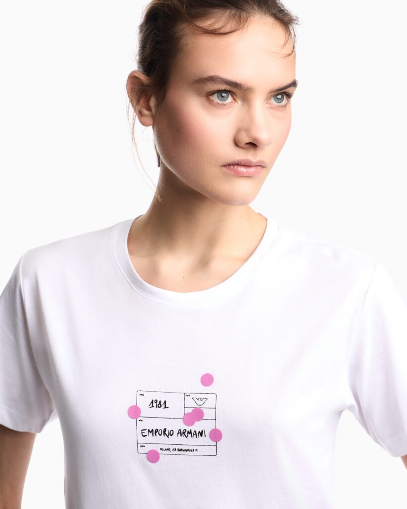 Itāļu luksusa zīmola Emporio Armani balts sieviešu T-krekls ar oriģinālu grafiskā dizaina attēlu. Izgatavots no viegla un elpojoša organiskās kokvilnas materiāla. Akcentēts ar kontrastējošiem rozā punktiem un zīmola logotipa detaļām.