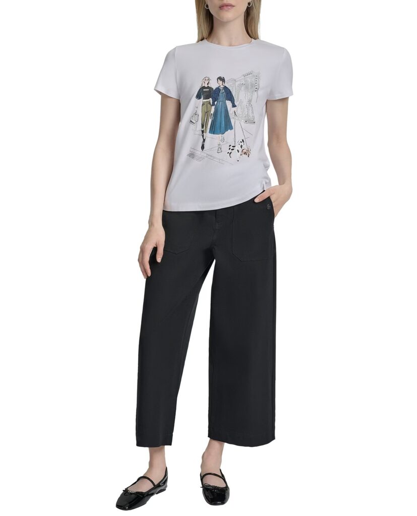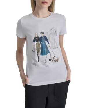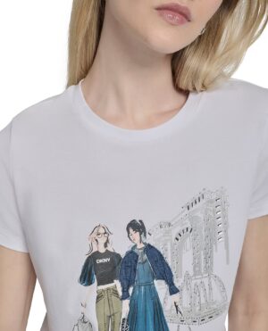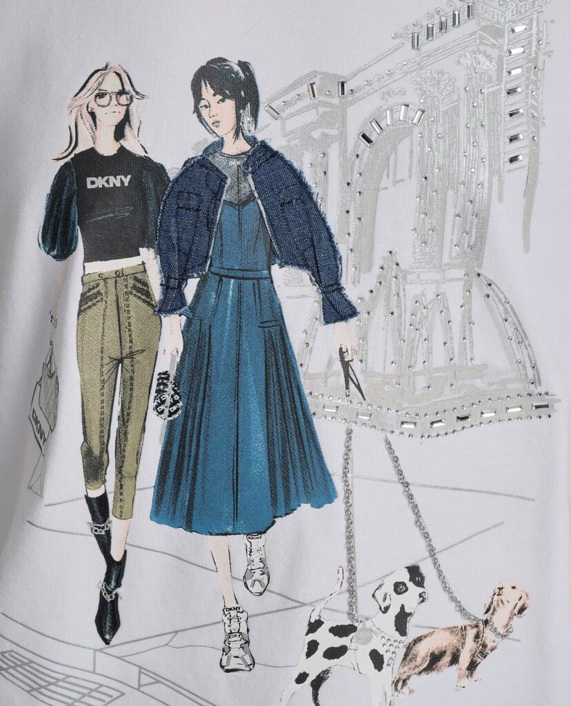 ASV modes zīmola DKNY balts sieviešu T-krekls ar krāsainu dizaina attēlu un mirdzošu kristālu apdari. Izgatavots no elastīga kokvilnas un modāla materiāla. Papildināts ar logo akcentiem.
