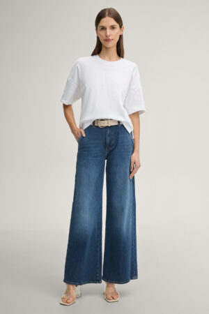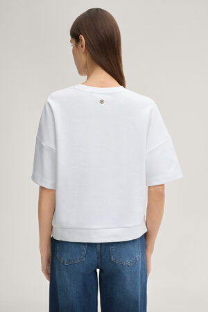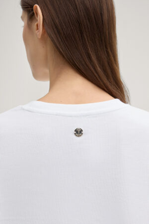 Vācu modes zīmola Joop! balts džempera stila T-krekls ar nolaistu plecu daļu un sānu šķēlumiem. Izgatavots no blīva kokvilnas maisījuma materiāla. Papildināts ar smalku vientoņa logo un rudzupuķes izšuvumu apakšmalā.