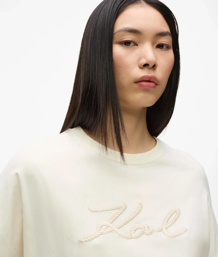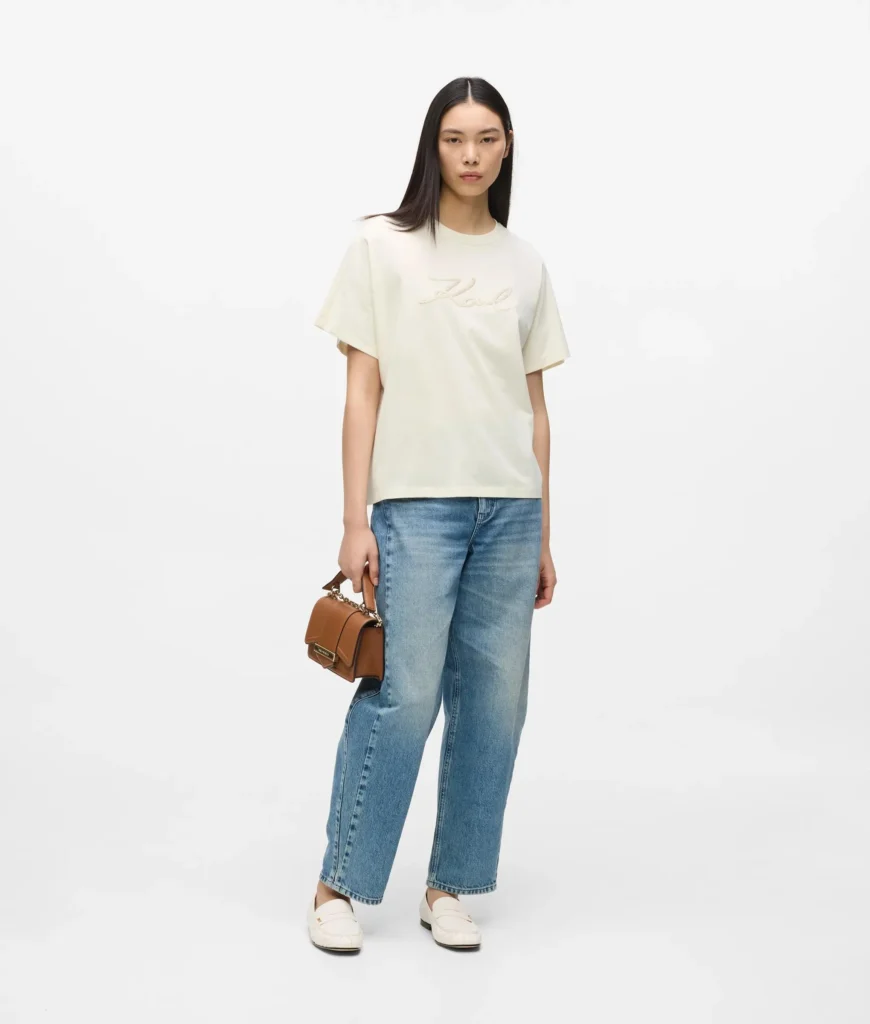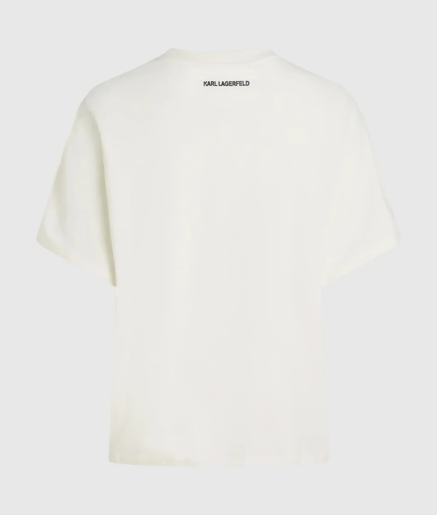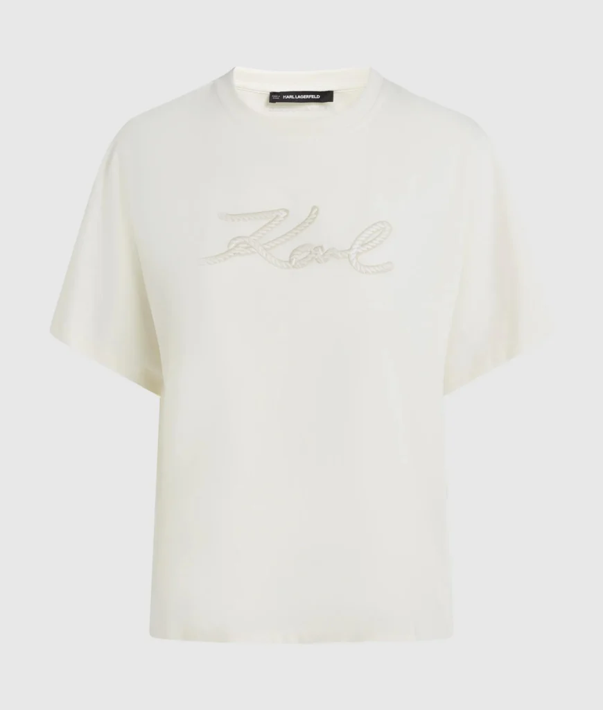 Vācu luksusa zīmola Karl Lagerfeld gaiši bēšs sieviešu T-krekls ar īsām plecu piedurknēm. Izgatavots no viegla organiskās kokvilnas materiāla. Akcentēts ar zīmola paraksta auklas veida izšuvumu un kontrastējošu logotipu pie apkakles mugurpusē.