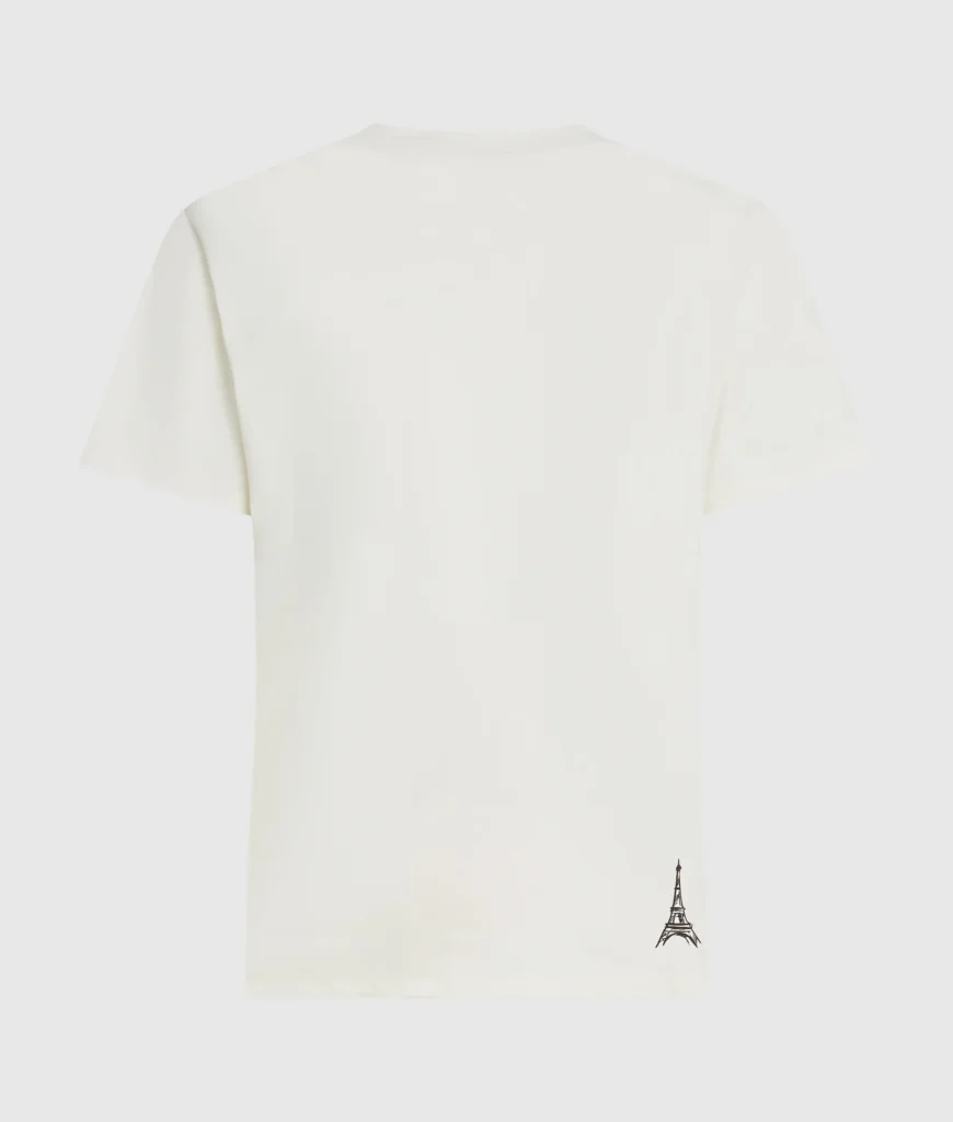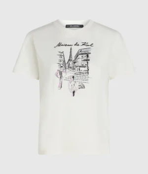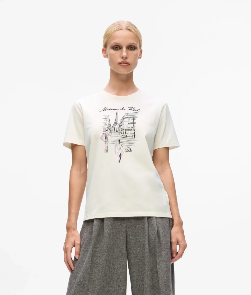 Vācu luksusa zīmola Karl Lagerfeld gaiši bēšs sieviešu T-krekls ar kontrastējošu Parīzes skices ilustrāciju un izšūtām detaļām. Izgatavots no 100% organiskās kokvilnas. Papildināts ar nelielu Eifeļa torņa akcentu mugurpusē.