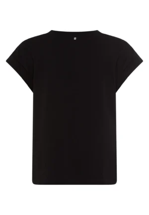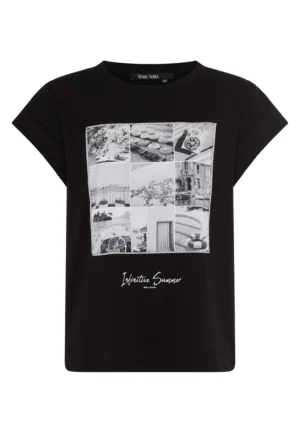 Vācu modes zīmola Marc Aurel melns brīva piegriezuma sieviešu T-krekls ar melnbaltu zīdaina auduma fotoattēlu kolāžu, smalkiem uzrakstiem un dekoratīvām nošuvēm. Izgatavots no mīksta kokvilnas materiāla. Papildināts ar fiksētiem piedurkņu atlokiem un smalku logo akcentu pie apkakles mugurpusē.