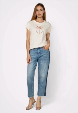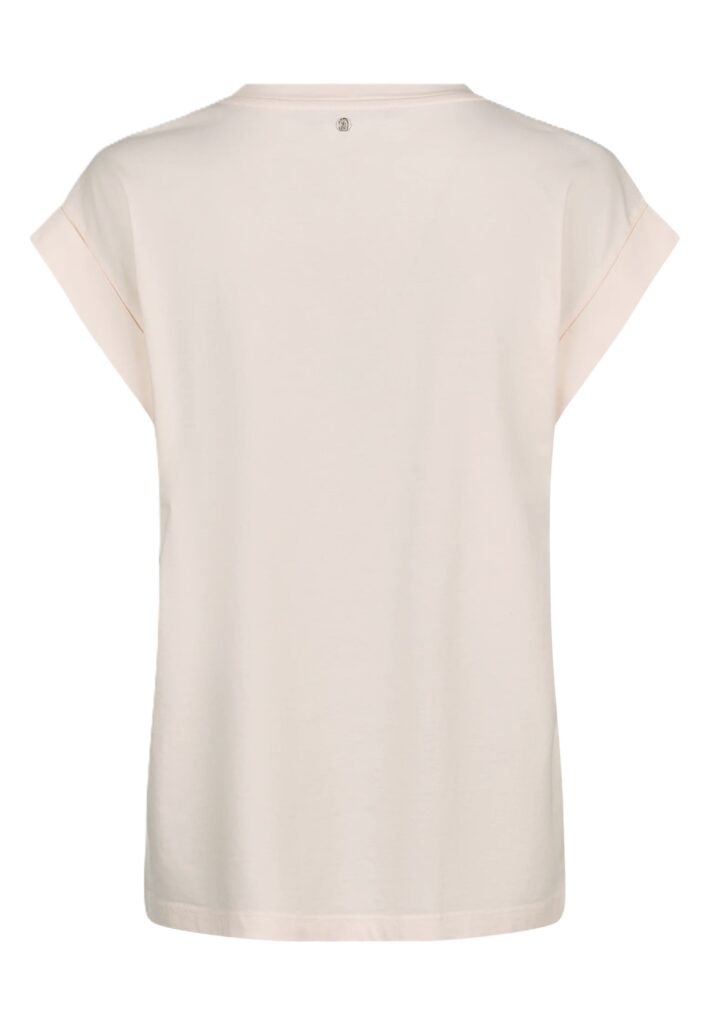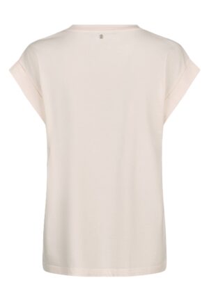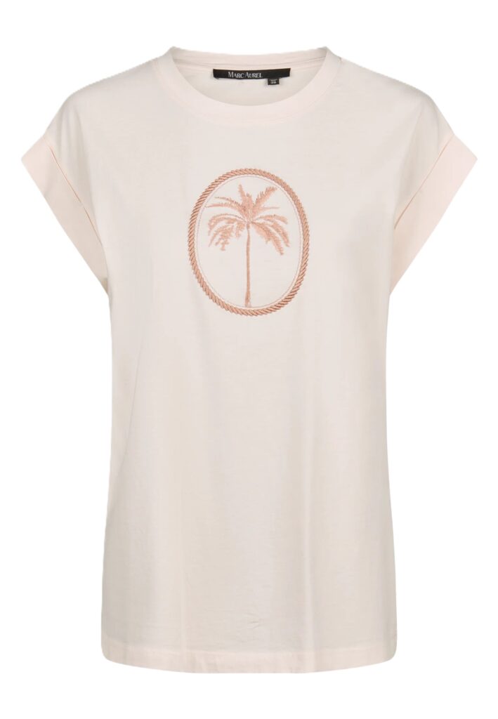 Vācu modes zīmola Marc Aurel maigi rozā sieviešu T-krekls ar fiksētiem plecu piedurkņu atlokiem. Izgatavots no mīksta kokvilnas materiāla. Papildināts ar palmas motīva izšuvumu no satīna diegiem un smalku logo akcentu pie apkakles mugurpusē.