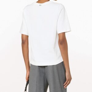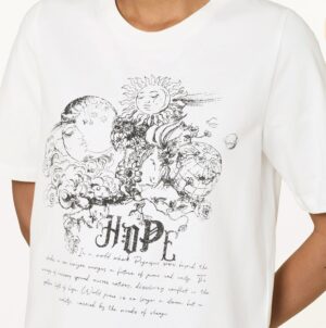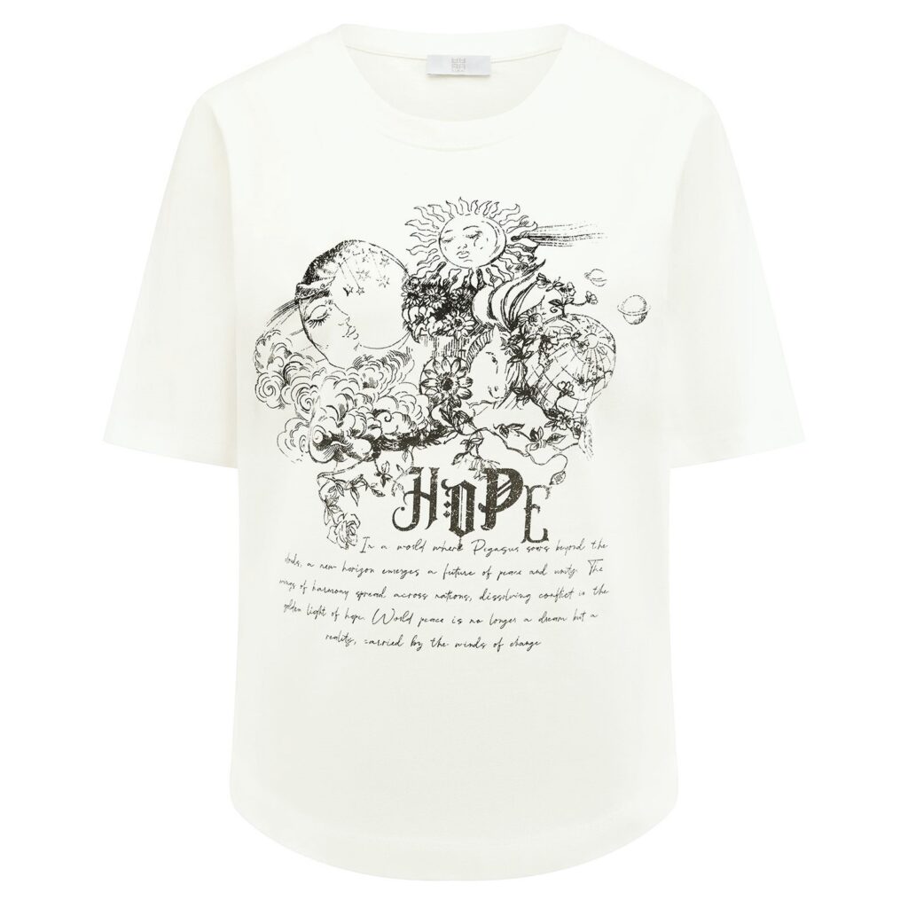 Vācu modes zīmola Riani krēmbalts sieviešu T-krekls ar izsmalcinātu dizaina attēlu un tekstu priekšpusē. Izgatavots no 100% kokvilnas ar īpaši mīkstu un samtainu tekstūru. Papildināts ar nelieliem sānu šķēlumiem. Akcentēts ar sudraba krāsas zīmola emblēmu mugurpusē.