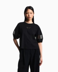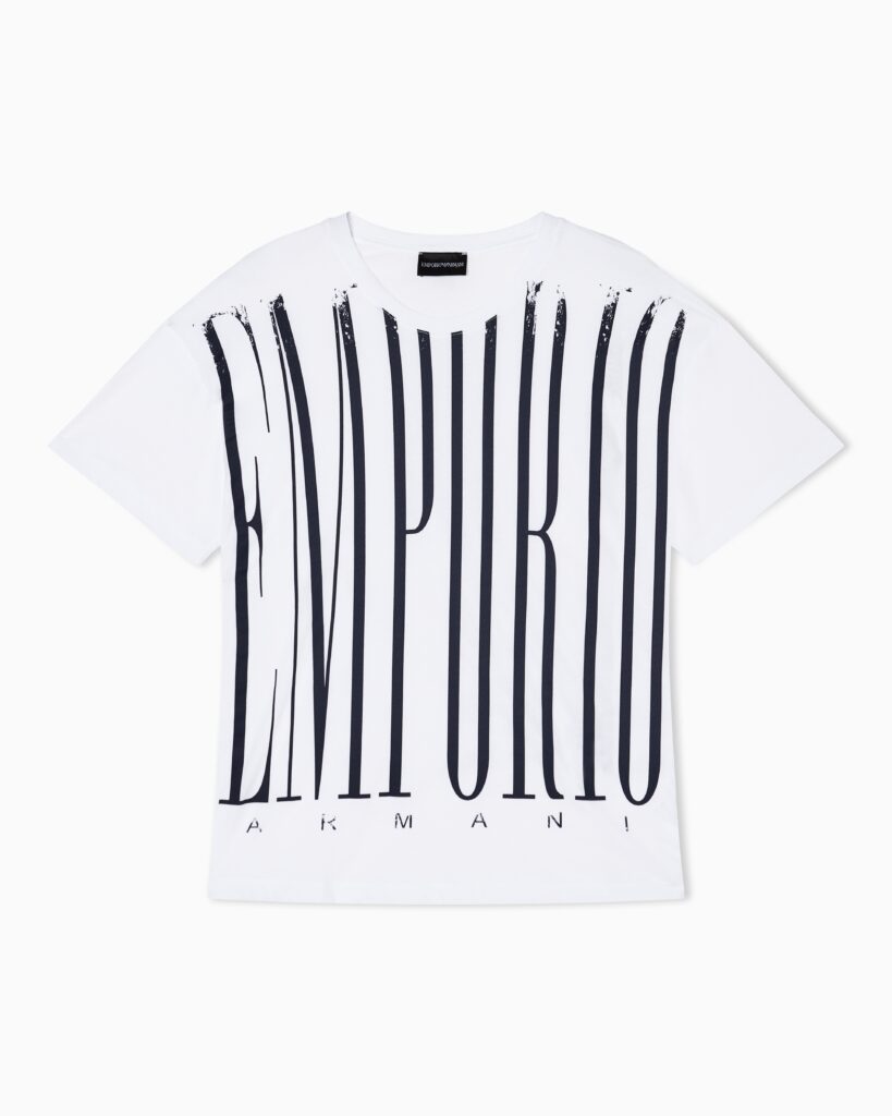 Itāļu luksusa zīmola Emporio Armani balts sieviešu T-krekls ar tumši zilu, vertikāli izstieptu logo dizaina attēlu priekšpusē. Izgatavots no viegla kokvilnas materiāla. Papildināts ar baltu zīmola logotipu pie apkakles mugurpusē.