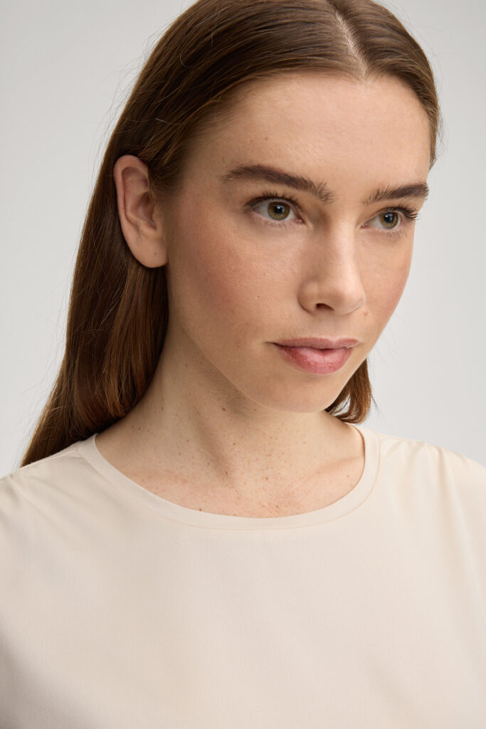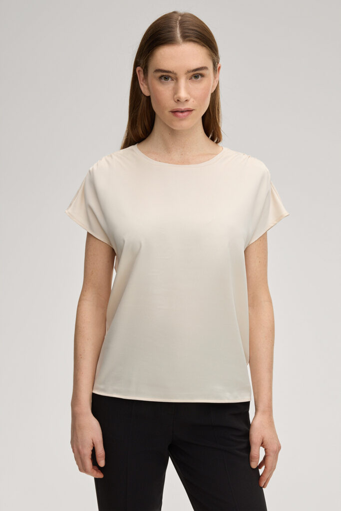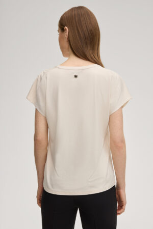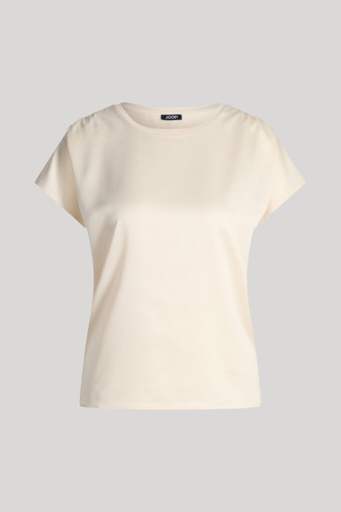 Vācu modes zīmola Joop! krēmīgi bēšs kombinētu struktūru tops ar īsām piedurknēm. Izgatavots no viegli elastīga viskozes materiāla ar satīna struktūru priekšpusē un mīkstu džersija audumu mugurpusē. Papildināts ar smalku krokojumu plecu daļā un zīmola logotipa akcentu pie apkakles.