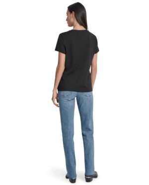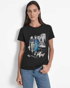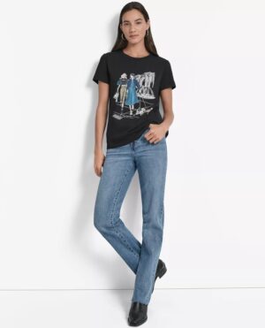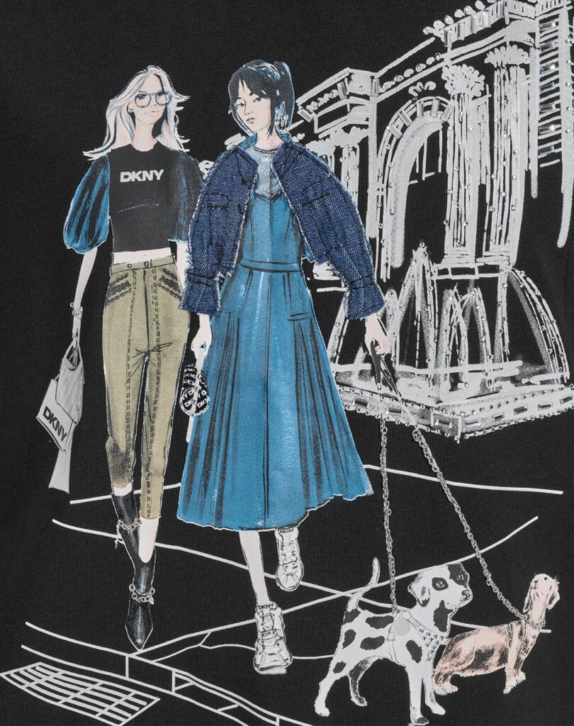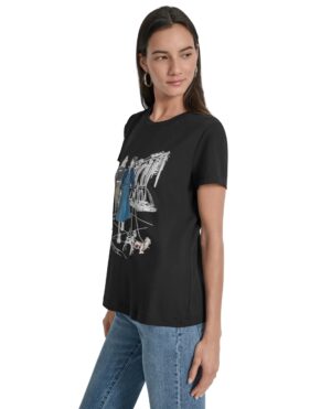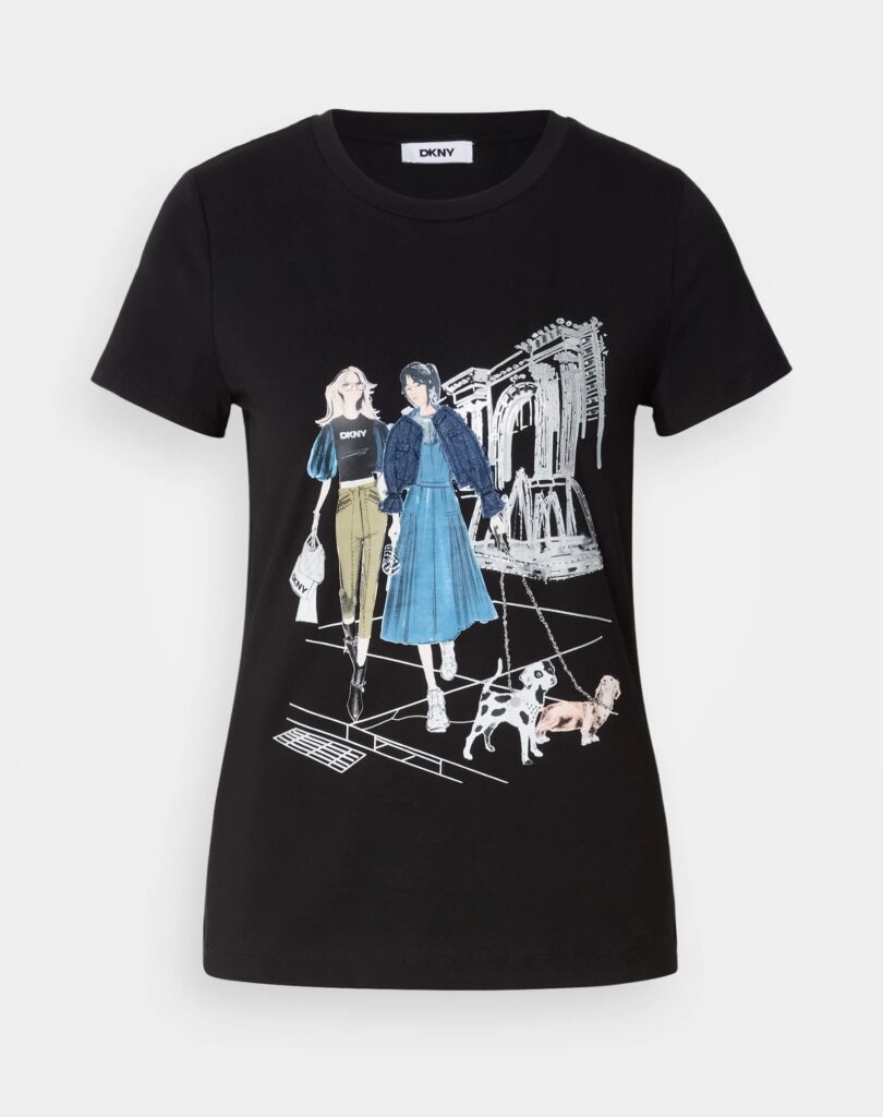 ASV modes zīmola DKNY melns sieviešu T-krekls ar krāsainu dizaina attēlu un mirdzošu kristālu apdari. Izgatavots no elastīga kokvilnas un modāla materiāla. Papildināts ar logo akcentiem.