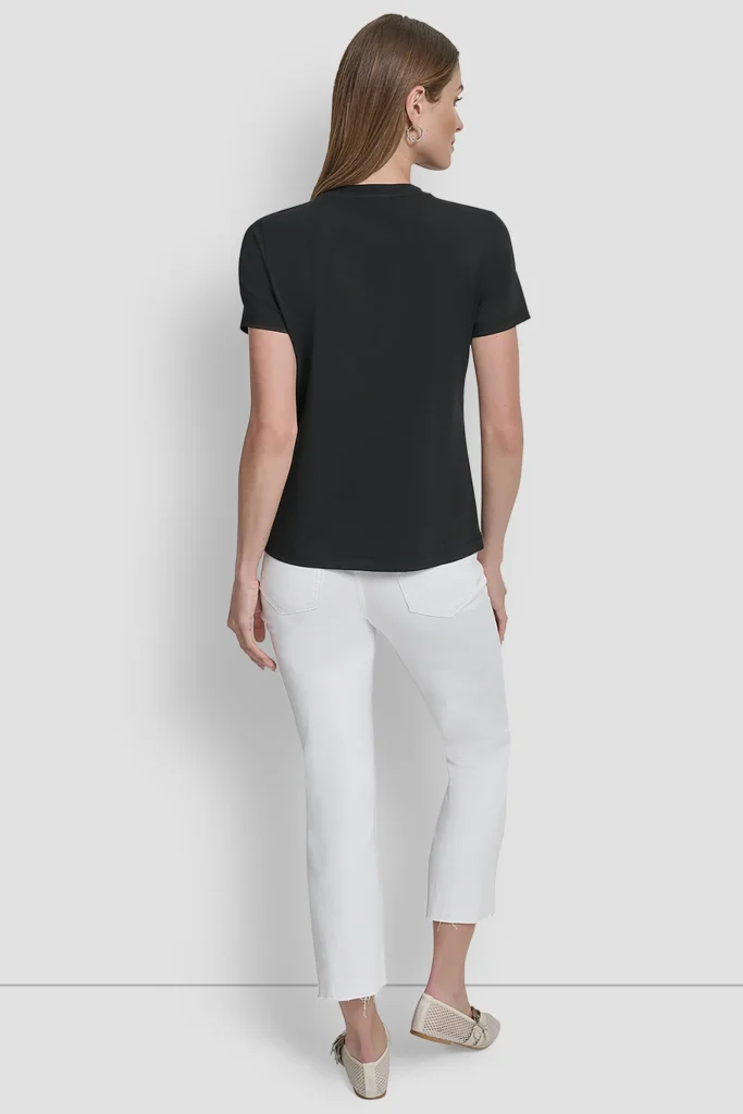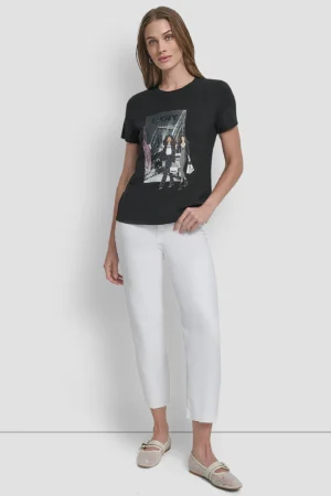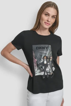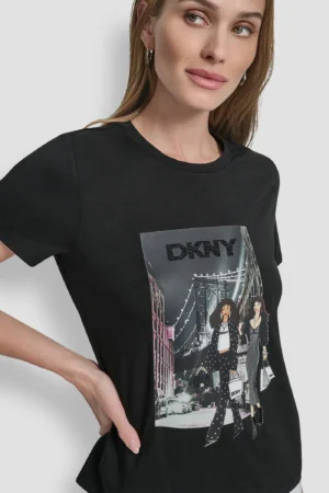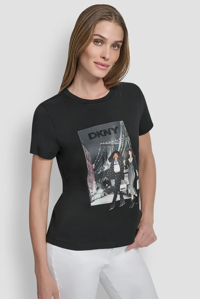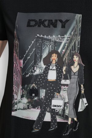 ASV modes zīmola DKNY melns sieviešu T-krekls ar Ņujorkas ielu dizaina attēlu un mirdzošiem akcentiem. Izgatavots no elastīga kokvilnas un modāla materiāla. Papildināts ar zīmola logo akcentu melni mirdzošu kristālu apdarē.