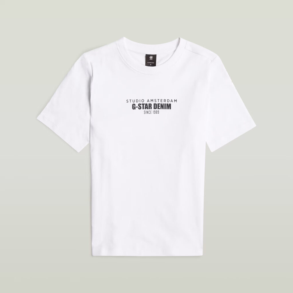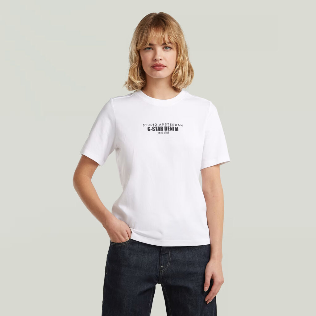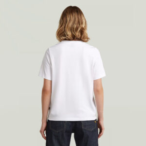 Nīderlandes zīmola G-Star Raw balts sieviešu T-krekls ar kontrastējošu zīmola uzrakstu melnā krāsā. Izgatavots no 100% organiskās kokvilnas. Papildināts ar zīmola emblēmas akcentu apakšmalā.