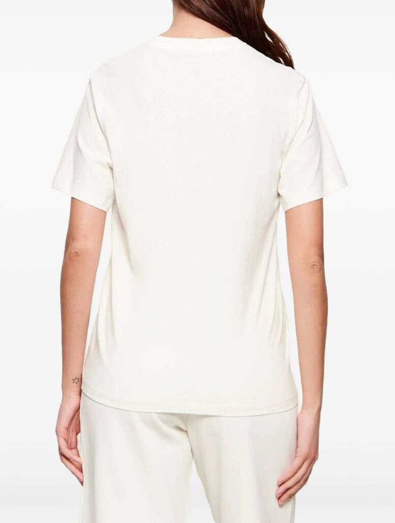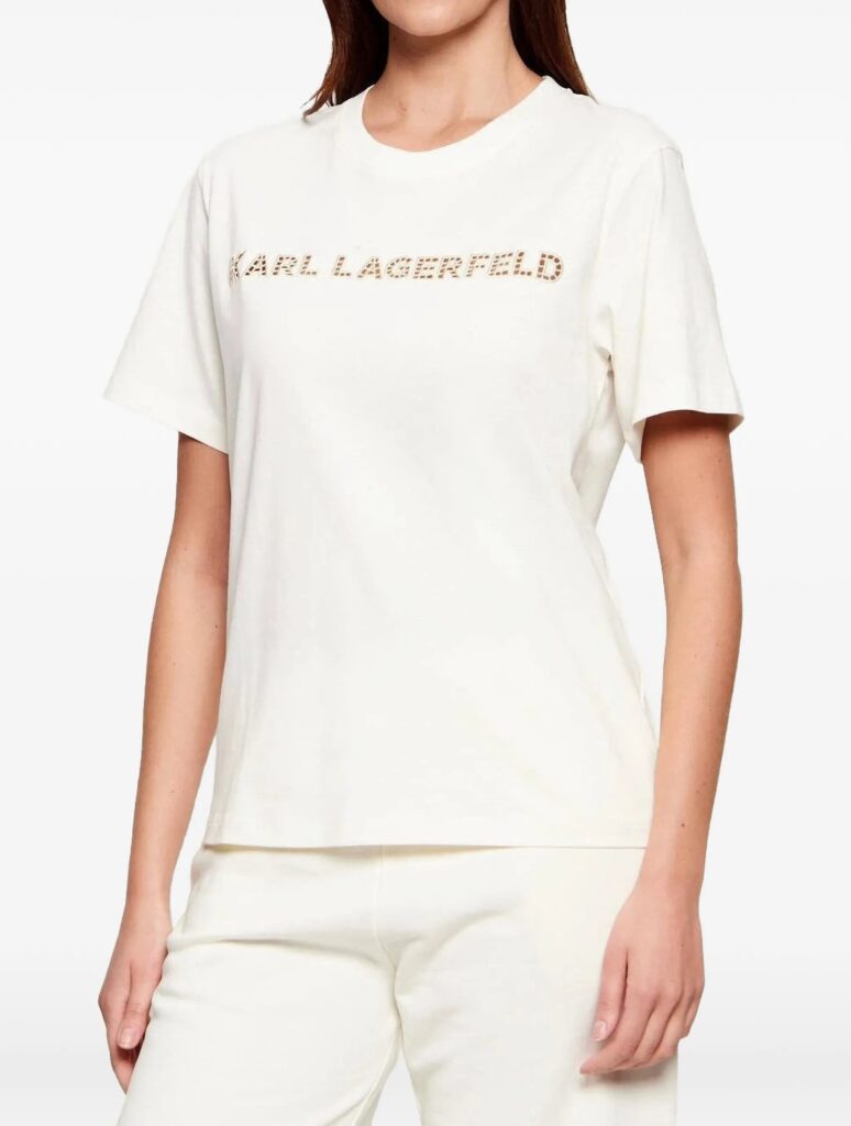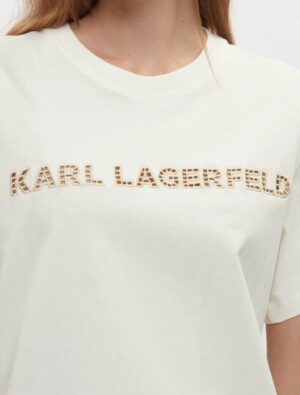 Vācu luksusa zīmola Karl Lagerfeld sieviešu T-krekls gaiši bēšā krāsā. Izgatavots no 100% organiskās kokvilnas. Akcentēts ar zeltaini bēšu zīmola logotipa mežģīņveida izšuvumu priekšpusē.
