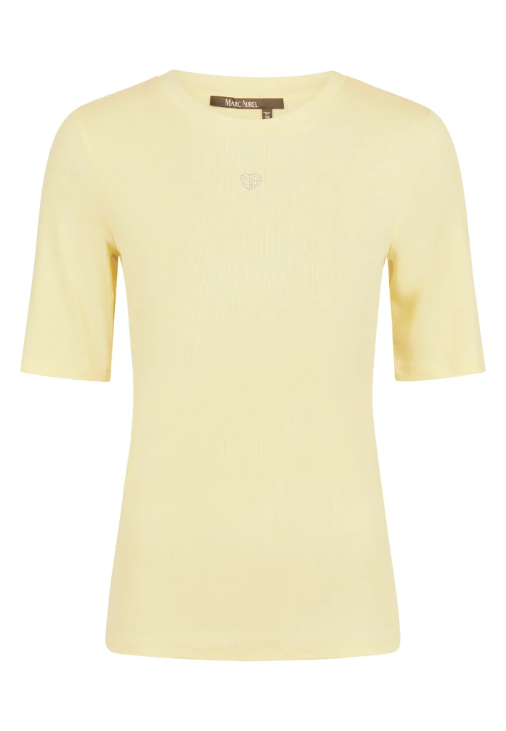Vācu modes zīmola Marc Aurel viegli pieguļošs sieviešu tops gaiši dzeltenā krāsā. Izgatavots no elastīga kokvilnas un modāla materiāla ar sīki rievotu tekstūru. Rotāts ar mirdzošu sirdsveida logotipu un smalku zīmola akcentu pie apkakles mugurpusē.