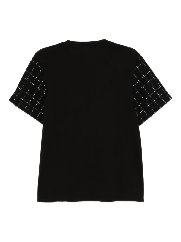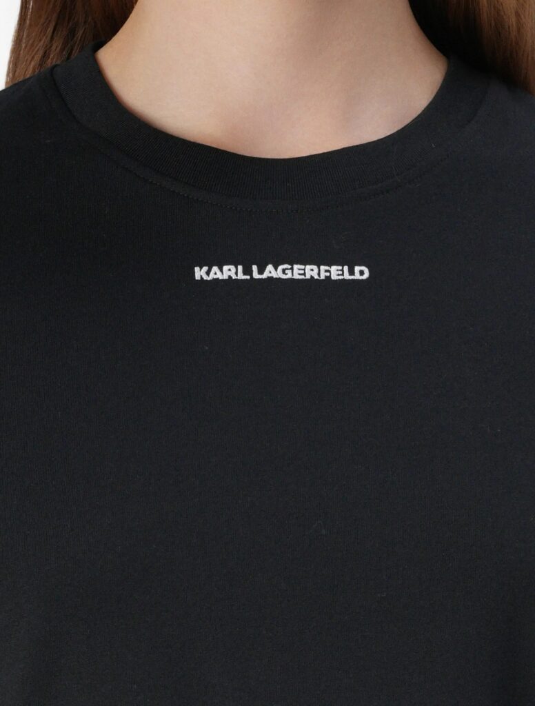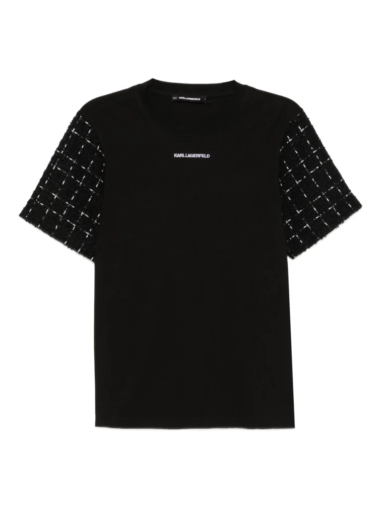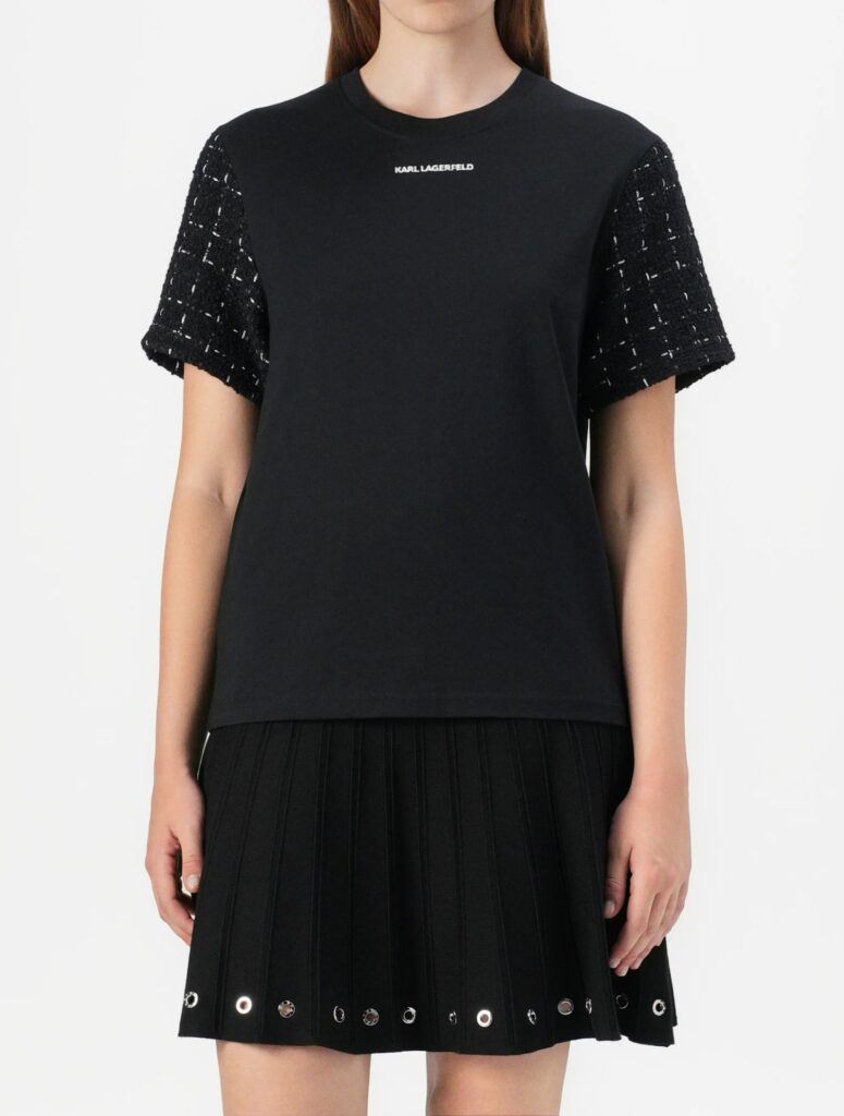 Vācu luksusa zīmola Karl Lagerfeld melns organiskās kokvilnas sieviešu T-krekls, ko papildina buklē auduma piedurknes ar vieglu kvardātveida rakstu no smalkām zīmola logotipa apdrukas lentītēm. Akcentēts ar logo izšuvumu pie apkakles.