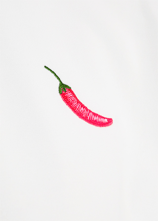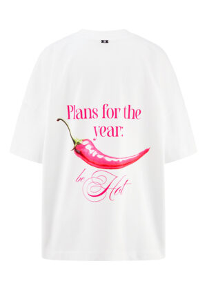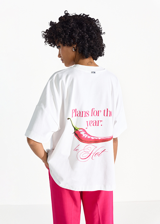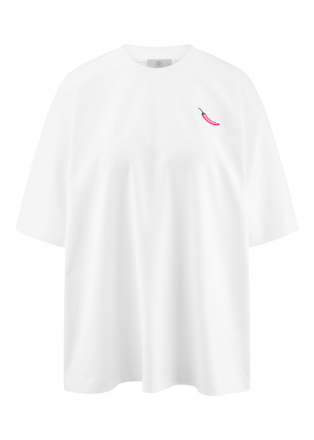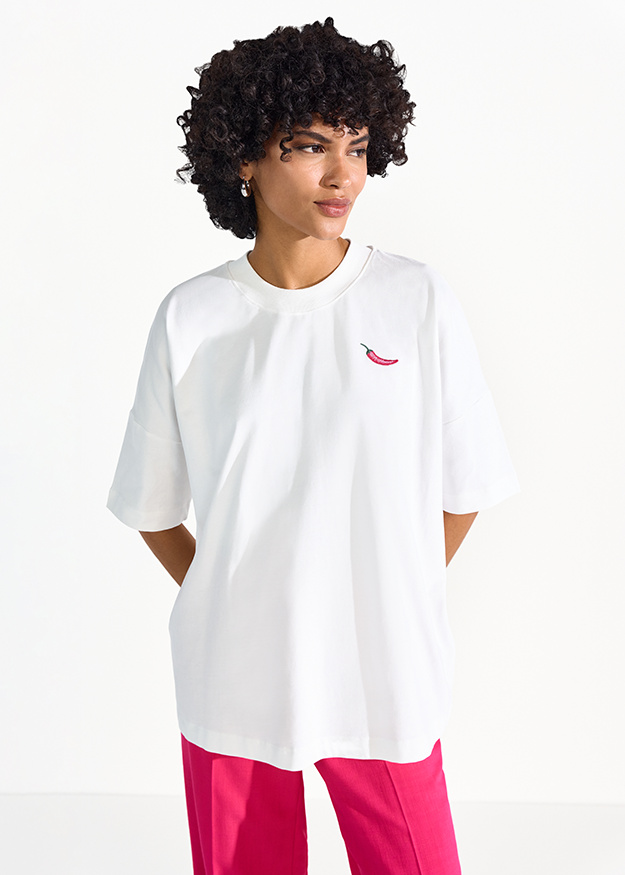 Vācu modes zīmola Riani balts brīva piegriezuma sieviešu T-krekls no īpaši mīksta un maiga kokvilnas materiāla. Akcentēts ar smalku čili izšuvumu priekšpusē un izteiksmīgu dizaina apdruku mugurpusē.