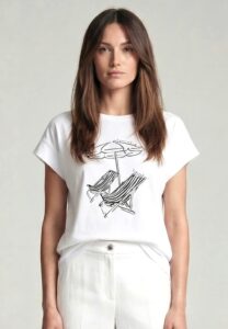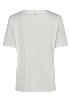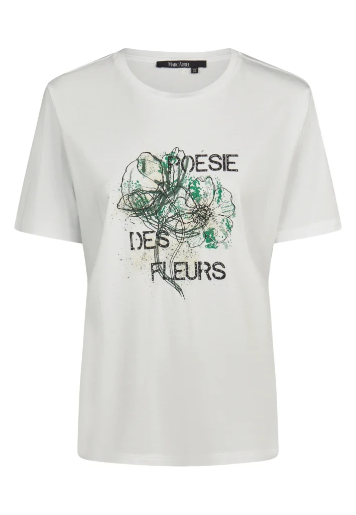 Vācu modes zīmola Marc Aurel balts sieviešu T-krekls ar grafisku zieda attēlu un smalki mirdzošu uzrakstu. Izgatavots no viegla kokvilnas un modāla materiāla. Papildināts ar smalku logo akcentu pie apkakles mugurpusē.