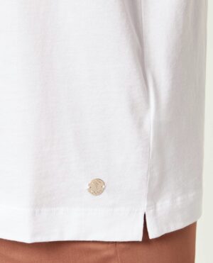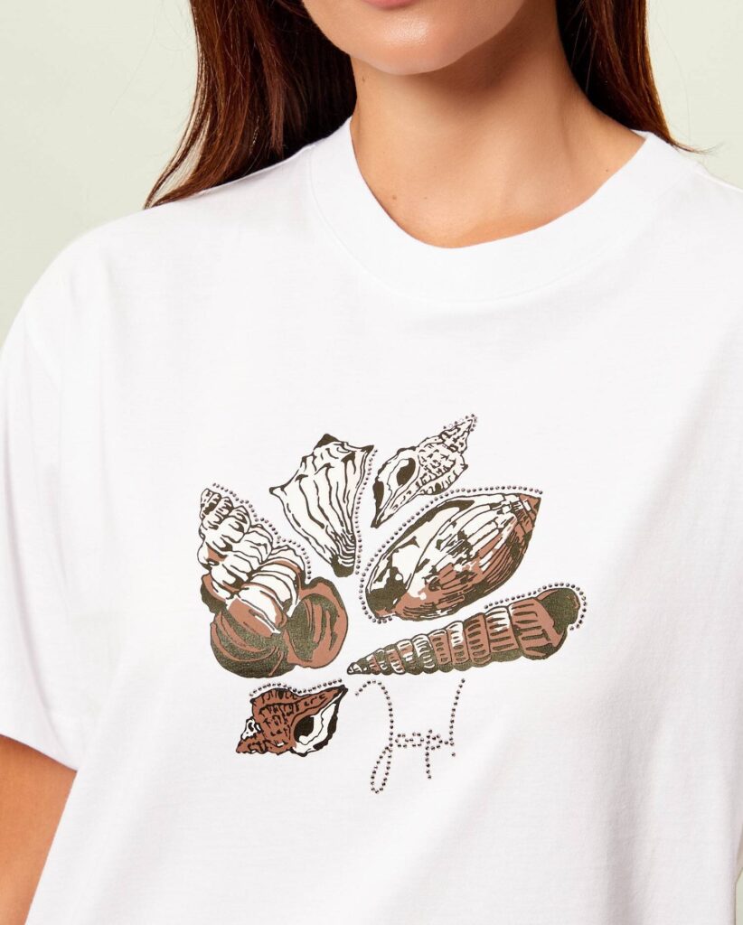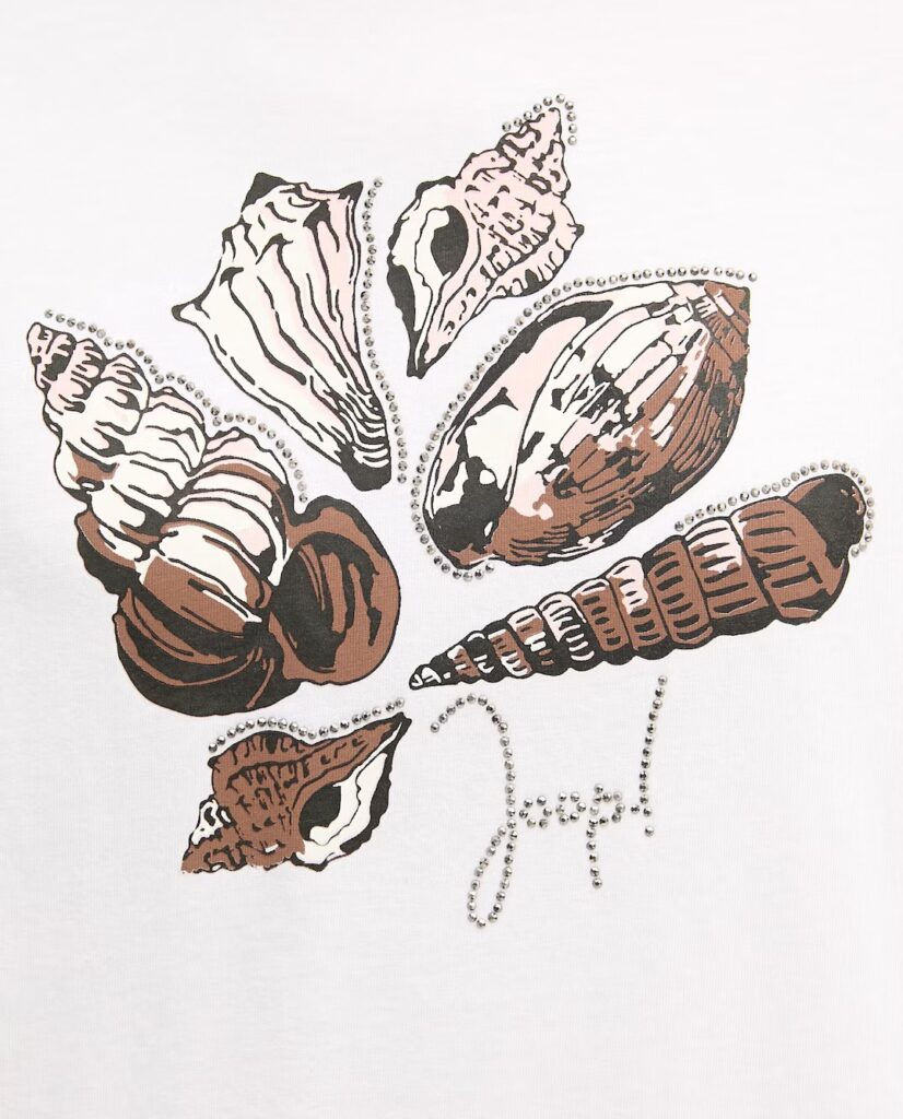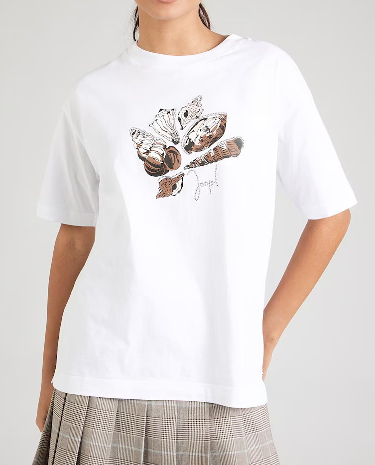 Vācu modes zīmola Joop! balts kokvilnas sieviešu T-krekls ar gliemežvāku dizaina attēlu brūnos un maigi rozā toņos, ko akcentē mirdzošu kristālu apdare un zīmola logotips.