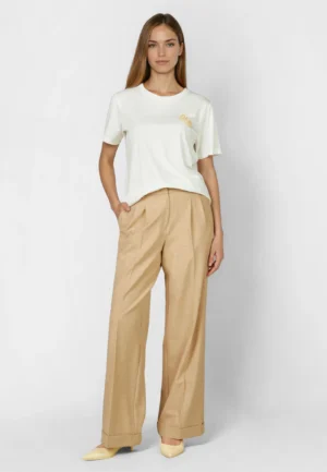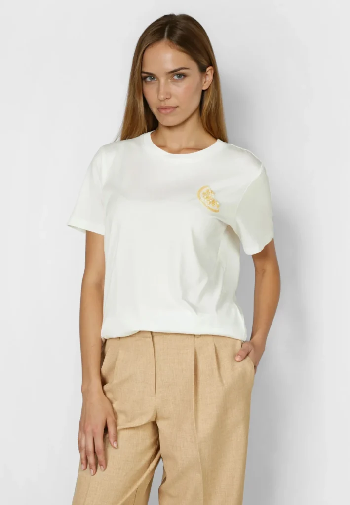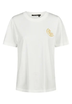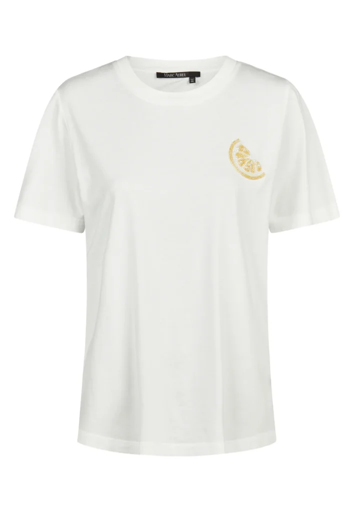 Vācu modes zīmola Marc Aurel balts sieviešu T-krekls ar izsmalcinātu citrona šķēlītes izšuvumu no dekoratīvām pērlītēm. Izgatavots no mīksta kokvilnas materiāla. Mugurpusē papildināts ar tematisku dizaina apdruku un smalku zīmola logotipa akcentu.