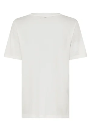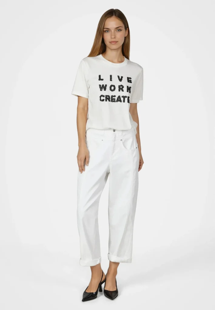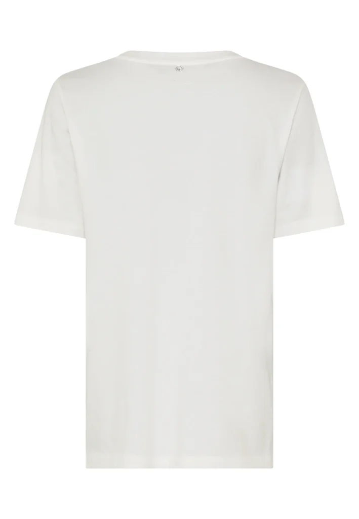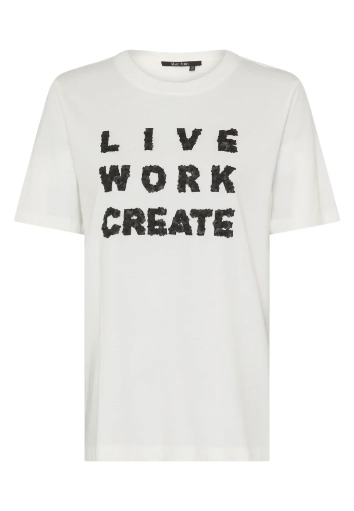 Vācu modes zīmola Marc Aurel krēmbalts brīva piegriezuma sieviešu T-krekls ar uzrakstu, kas veidots no smalkiem dabīgās ādas ziediņiem un dekoratīvām pērlītēm. Izgatavots no mīksta kokvilnas materiāla. Papildināts ar zīmola logotipa akcentu pie apkakles mugurpusē.