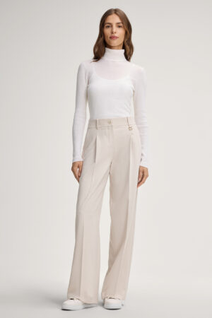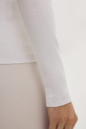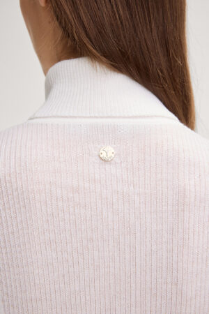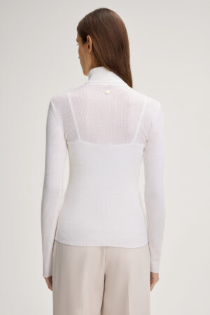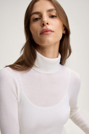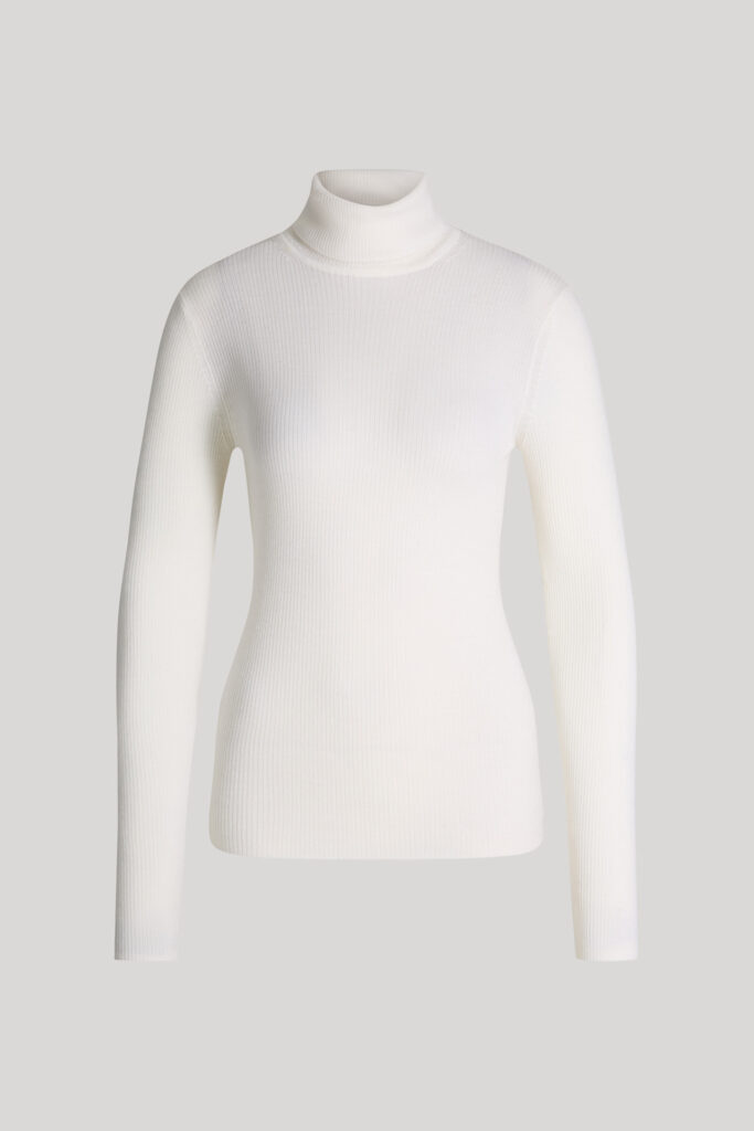 Vācu modes zīmola Joop! pieguļošs askētiska dizaina sieviešu džemperis krēmbaltā krāsā. Izgatavots no plānas un mīkstas vilnas dzijas rievota adījuma rakstā. Papildināts ar augstu atlokāmo apkakli un smalku zīmola logotipa akcentu mugurpusē.