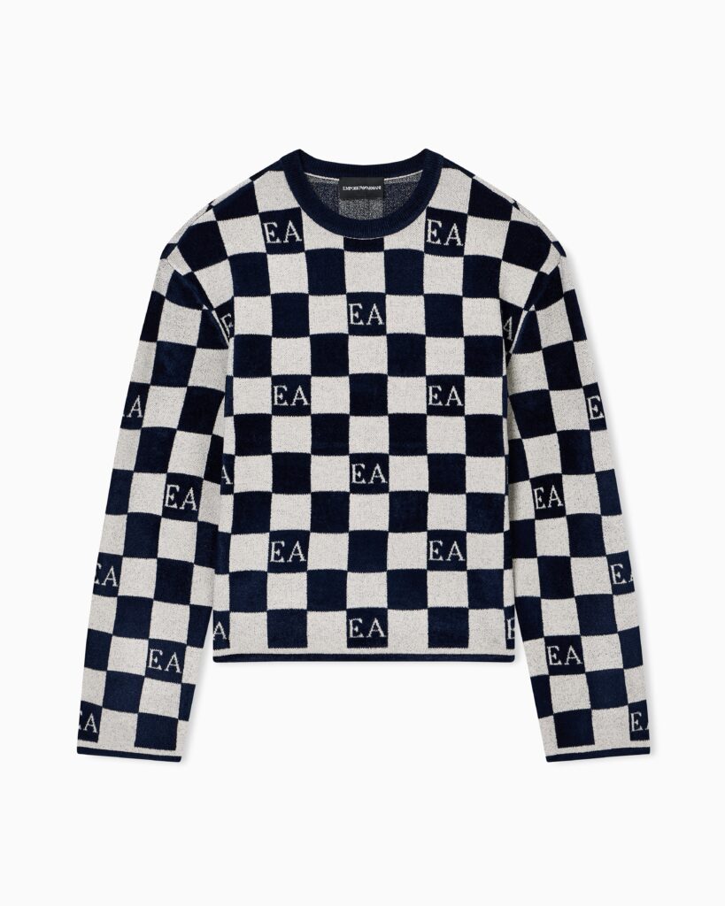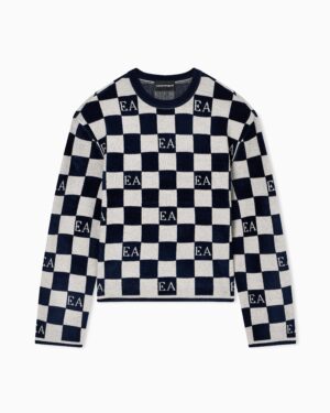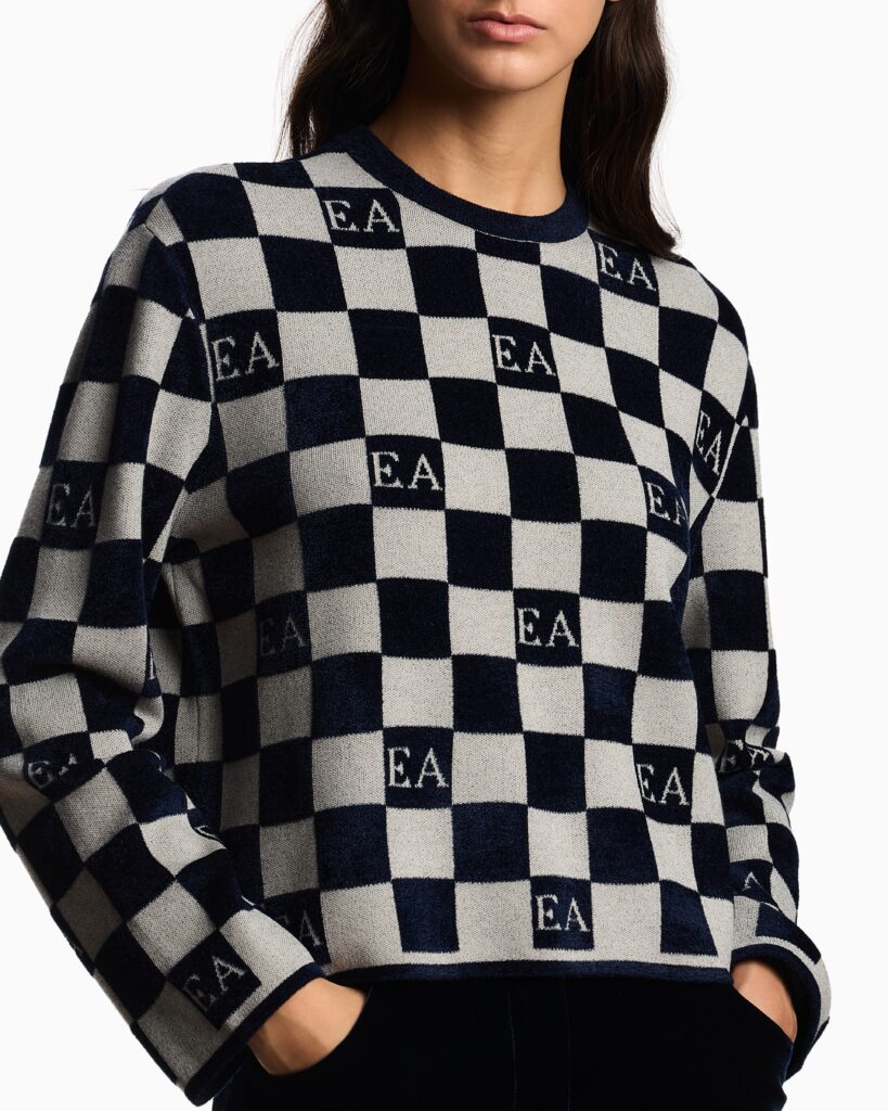Itāļu luksusa zīmola Emporio Armani komfortabls sieviešu džemperis ar kontrastējošu kvadrātveida rakstu tumši zilā un pelēcīgi bēšā krāsā. Izgatavots no mīksta šenila un žakarda materiāla. Papildināts ar zīmola monogrammas akcentiem.