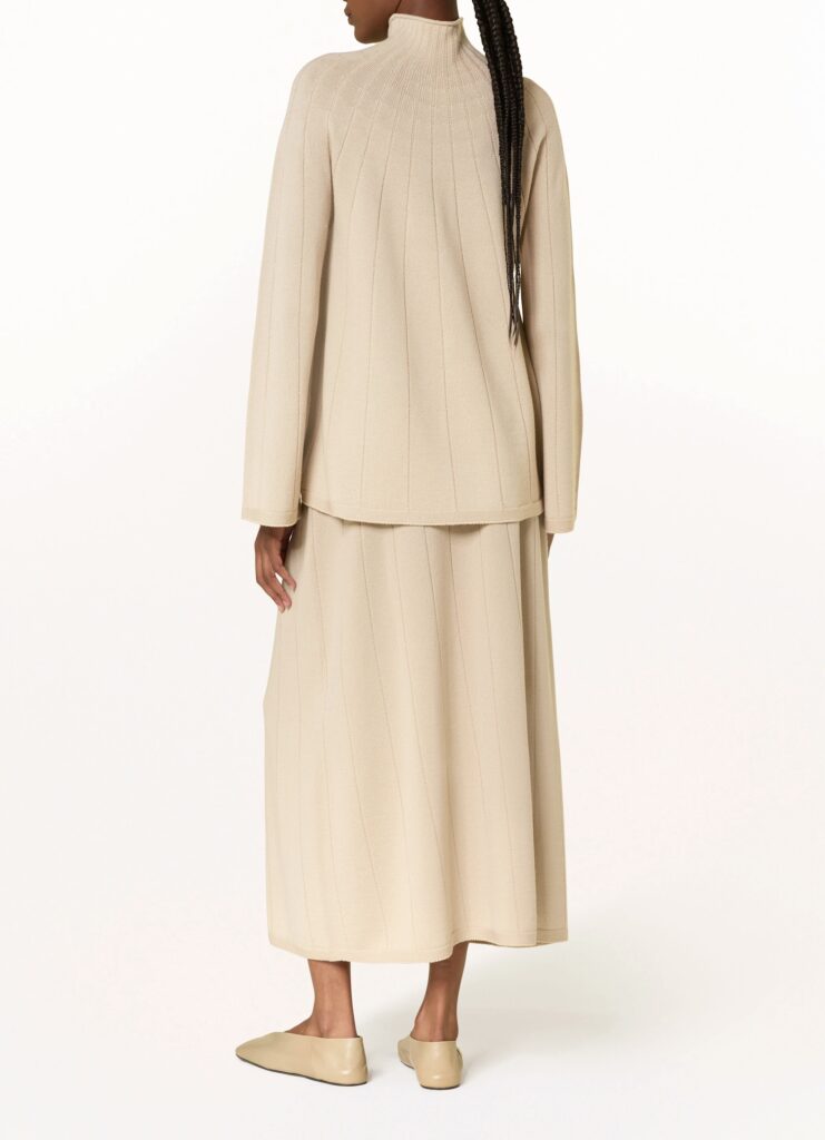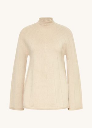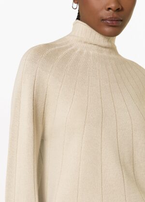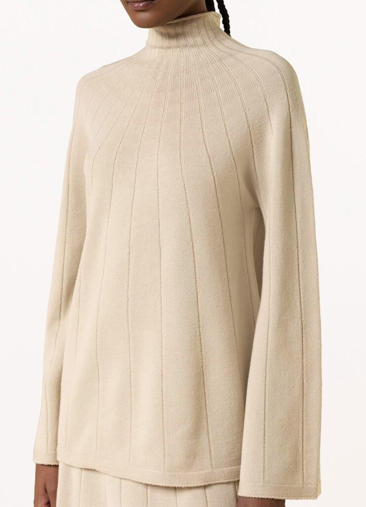 Itāļu modes zīmola MM by Max Mara sieviešu džemperis gaiši pelēcīgi bēšā krāsā. Izgatavots no īpaši mīkstas jaunvilnas dzijas ar dekoratīva adījuma struktūru. Papildināts ar paaugstinātu piltuves veida apkakli.