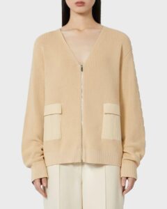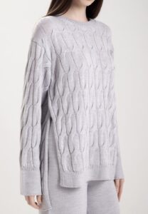 Itāļu modes zīmola MM by Max Mara sieviešu džemperis gaiši pelēcīgi bēšā krāsā. Izgatavots no īpaši mīkstas jaunvilnas dzijas ar dekoratīva adījuma struktūru. Papildināts ar paaugstinātu piltuves veida apkakli.