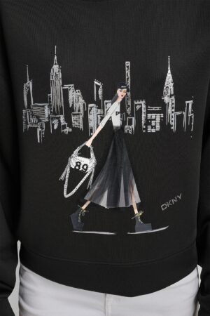ASV modes zīmola DKNY melns sieviešu sportiskā stila džemperis ar kontrastējošu Ņujorkas meitenes dizaina attēlu un spoži mirdzošiem akcentiem. Izgatavots no elastīga poliestera materiāla. Papildināts ar smalkām tilla un zīmola logotipa detaļām.