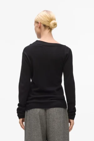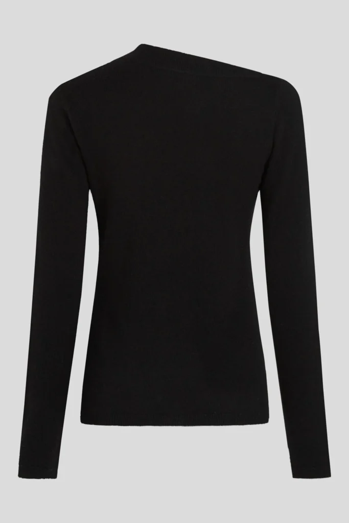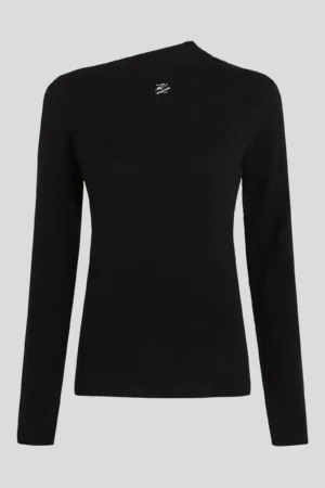 Vācu luksusa zīmola Karl Lagerfeld melns sieviešu džemperis ar asimetrisku kakla izgriezumu. Izgatavots no maigas un mīkstas augstākās kvalitātes kašmira dzijas. Papildināts ar smalku zīmola monogrammas izšuvumu un smalki rievotu apdari.