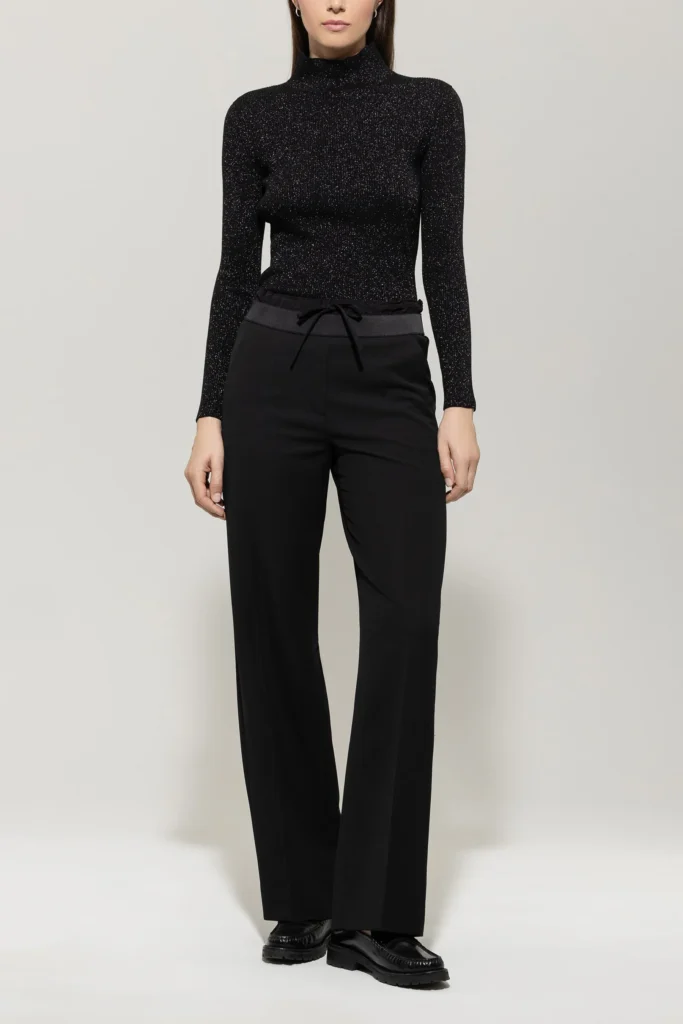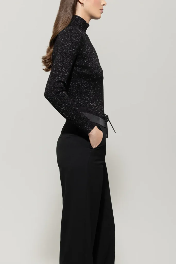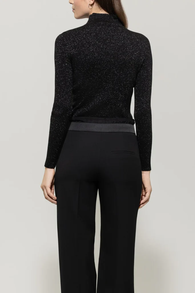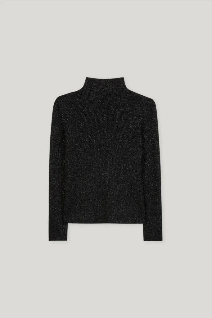 Vācu premium klases apģērbu zīmola Luisa Cerano pieguļošs sieviešu džemperis melnā krāsā ar sudrabainu mirdzumu. Izgatavots no elastīga viskozes maisījuma materiāla ar smalki rievotu tekstūru. Papildināts ar augstu apkakli.
