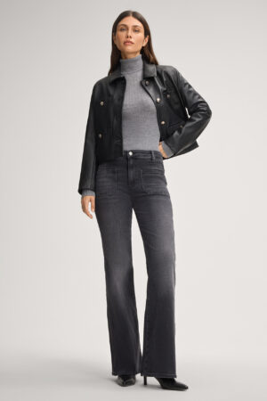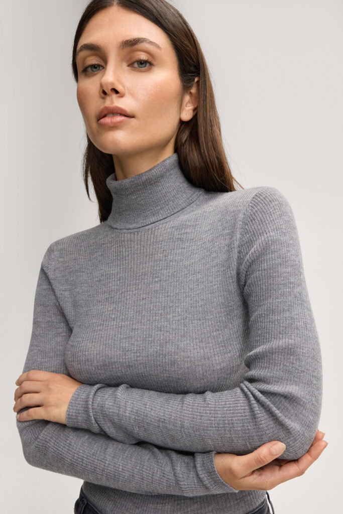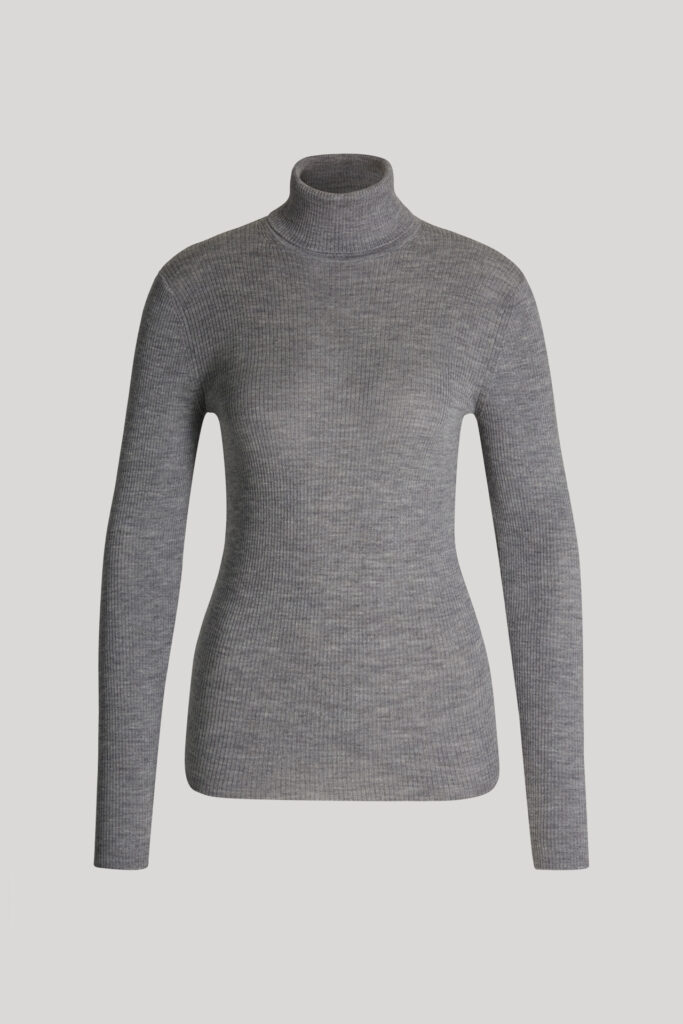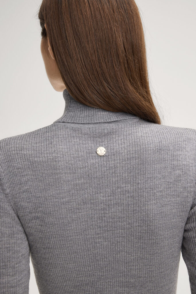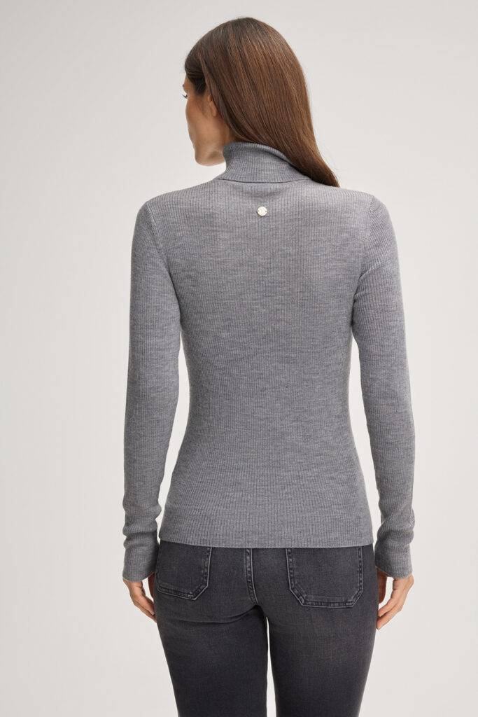 Vācu modes zīmola Joop! pieguļošs askētiska dizaina sieviešu džemperis pelēkā krāsā. Izgatavots no plānas un mīkstas vilnas dzijas rievota adījuma rakstā. Papildināts ar augstu atlokāmo apkakli un smalku zīmola logotipa akcentu mugurpusē.