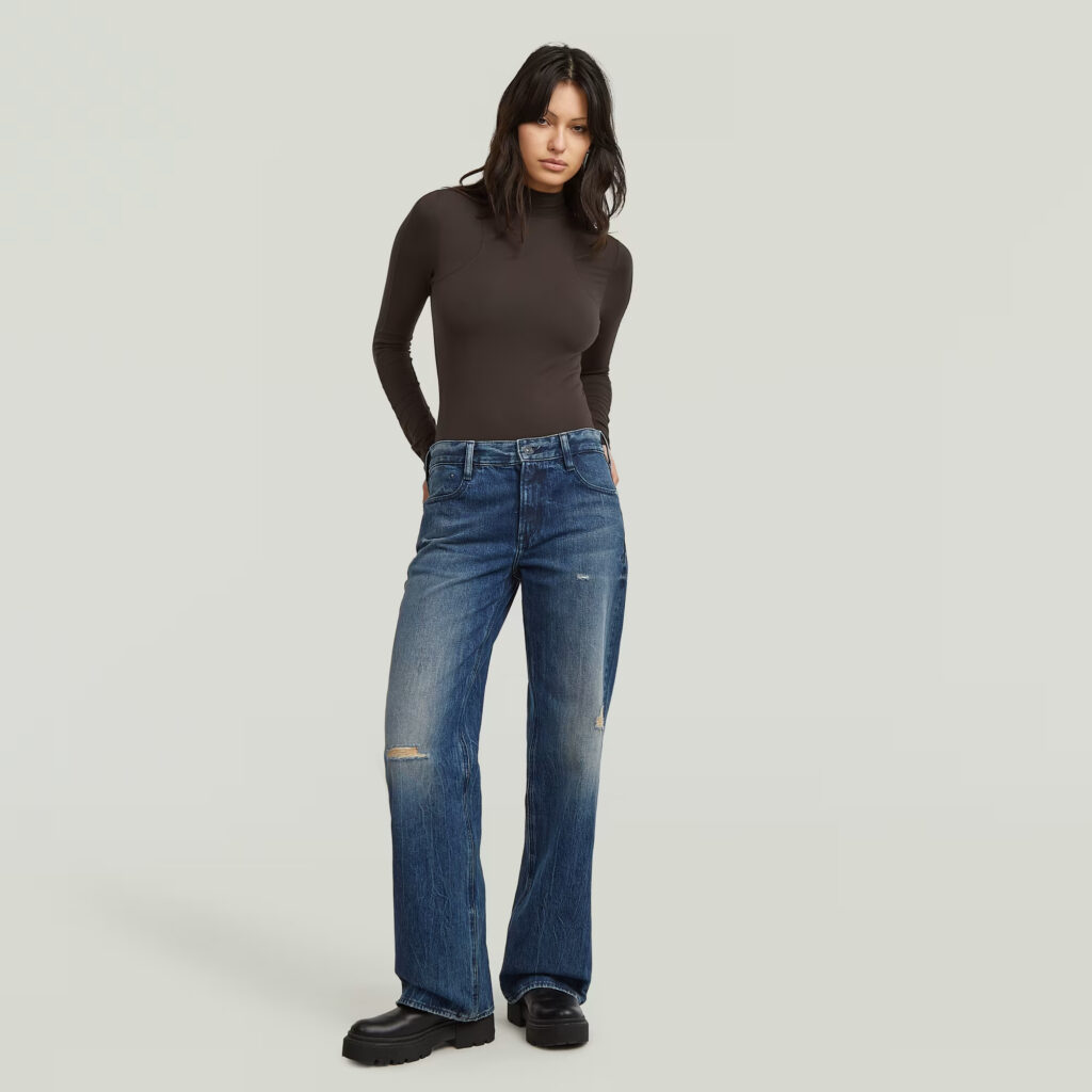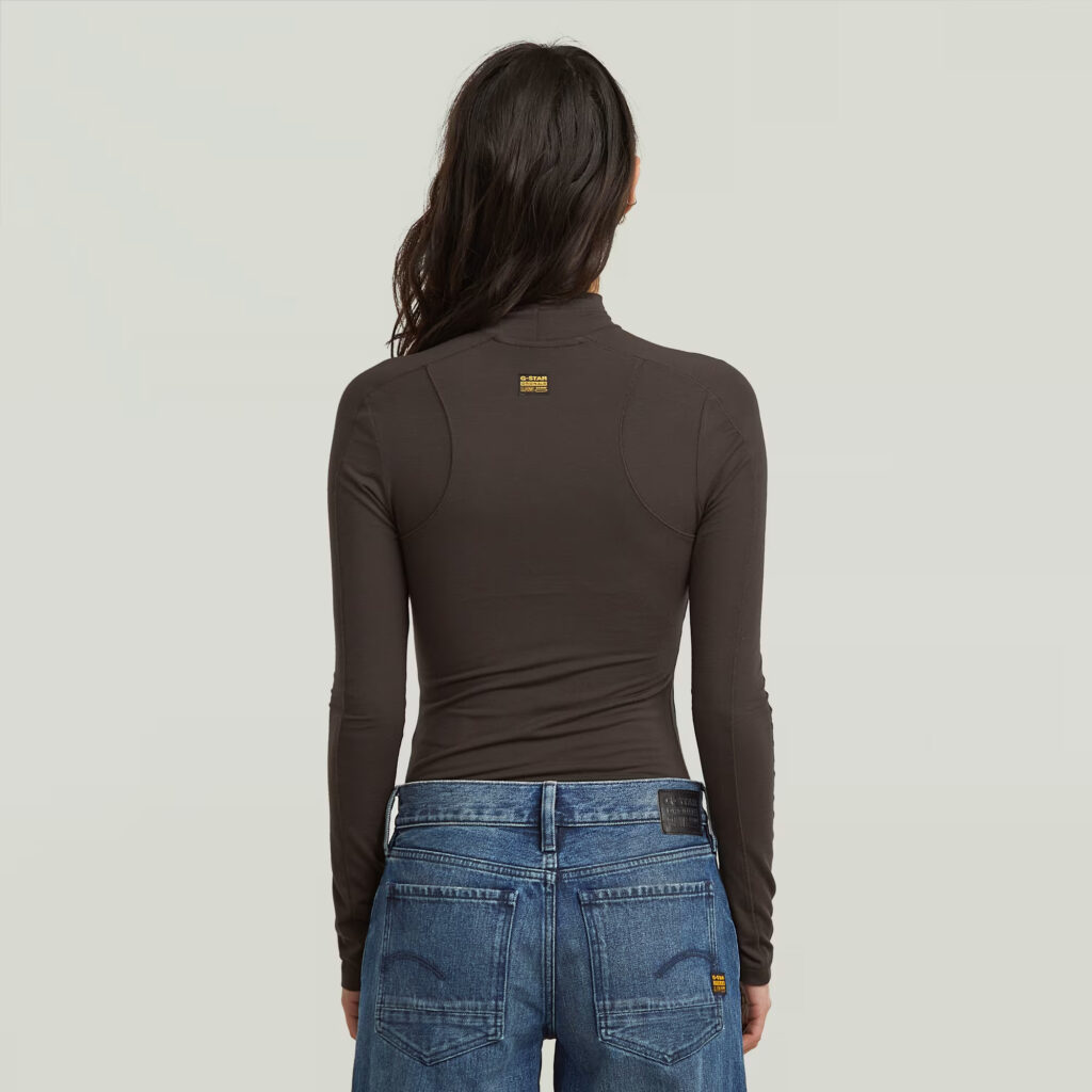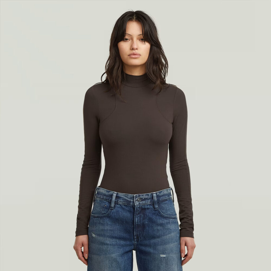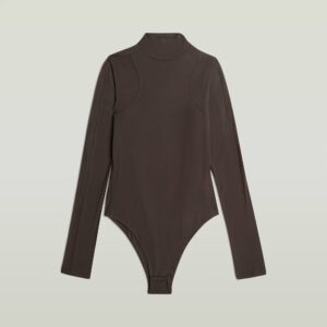Nīderlandes zīmola G-Star Raw pieguļošs sieviešu bodijs tumšā, šokolādes brūnā krāsā. Izgatavots no viegla un elastīga modāla materiāla. Akcentēts ar dekoratīvām, siluetu veidojošām vīlēm un kontrastējošu zīmola emblēmu mugurpusē.