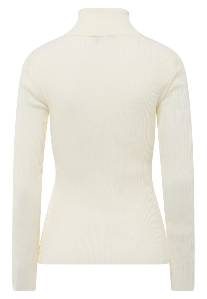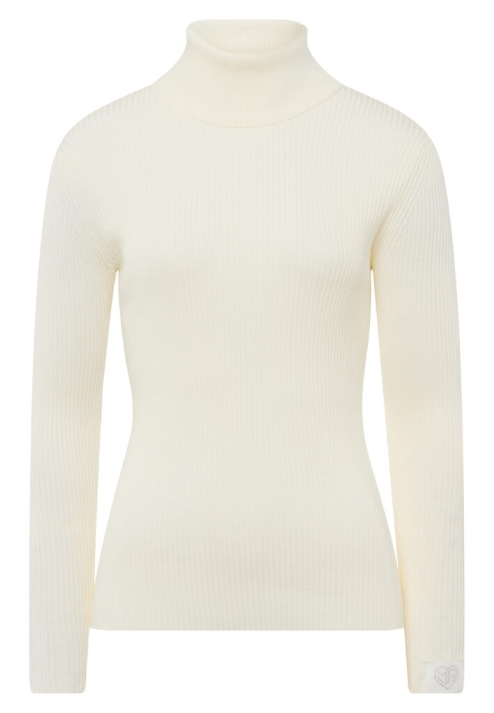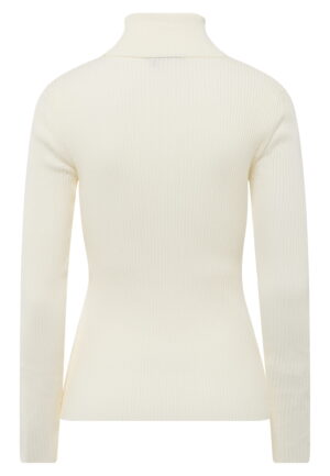 Vācu modes zīmola Marc Aurel pieguļošs sieviešu džemperis krēmbaltā krāsā. Izgatavots no viskozes maisījuma dzijas elastīga rievotā adījuma rakstā. Papildināts ar augstu atlokāmo apkakli un emblēmu ar mirdzošu sirdsveida logotipu uz aproces.