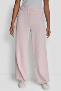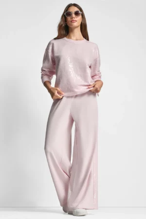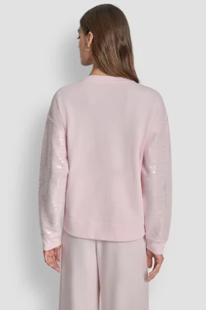 ASV modes zīmola DKNY gaiši rozā sieviešu sportiskā stila džemperis ar caurspīdīgu fliteru apdari priekšpusē un piedurknēs. Izgatavots no mīksta kokvilnas maisījuma materiāla. Papildināts ar smalki rievotu apdari, nelieliem sānu šķēlumiem un sudraba krāsas logo akcentu apakšmalā.