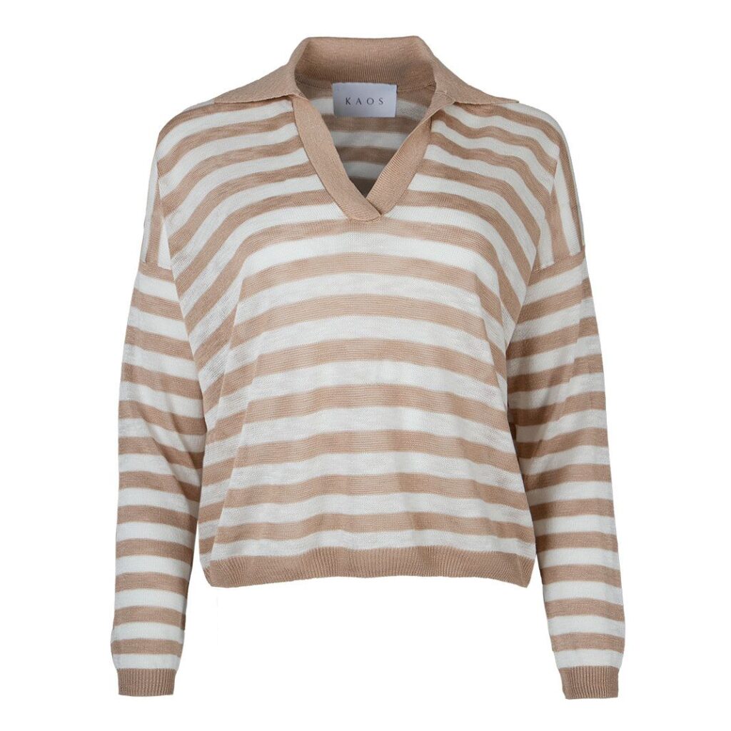 Itāļu modes zīmola KAOS lielizmēra piegriezuma sieviešu tops ar horizontālu svītru rakstu pelēcīgi bēšā krāsā. Izgatavots no īpaši viegla un smalka viskozes maisījuma materiāla. Papildināts ar V veida izgriezumu un polo apkakli.