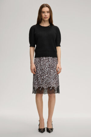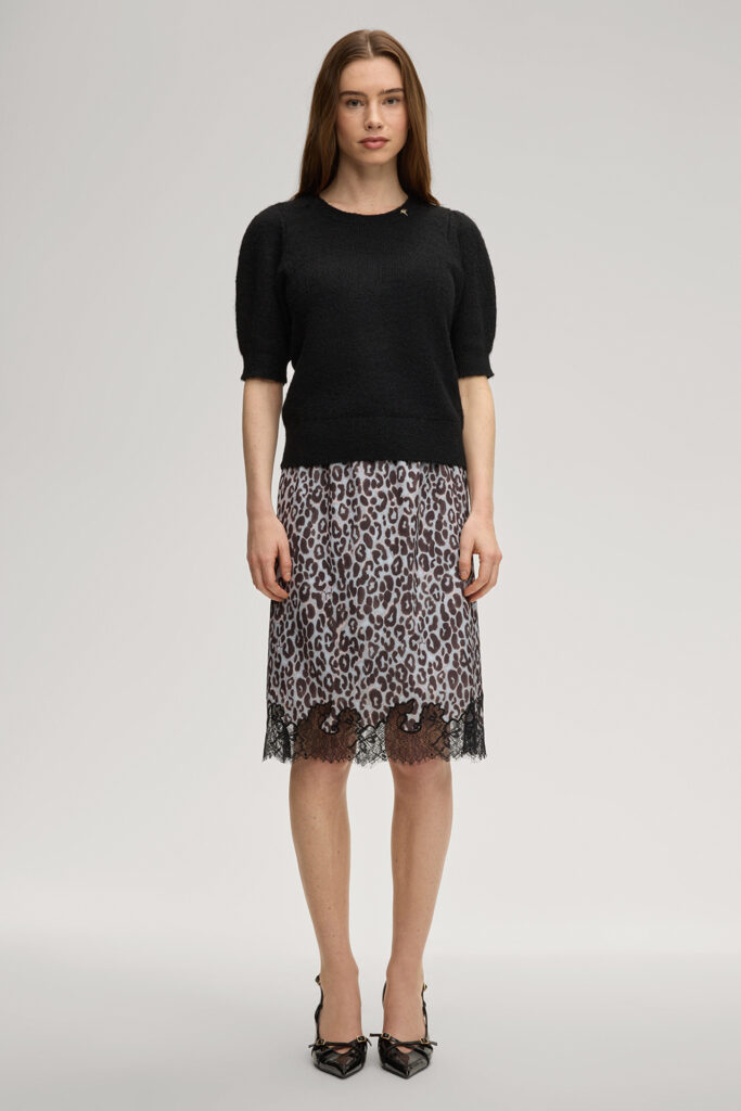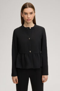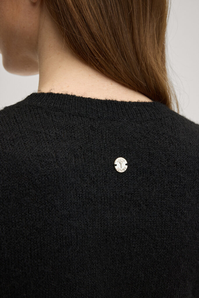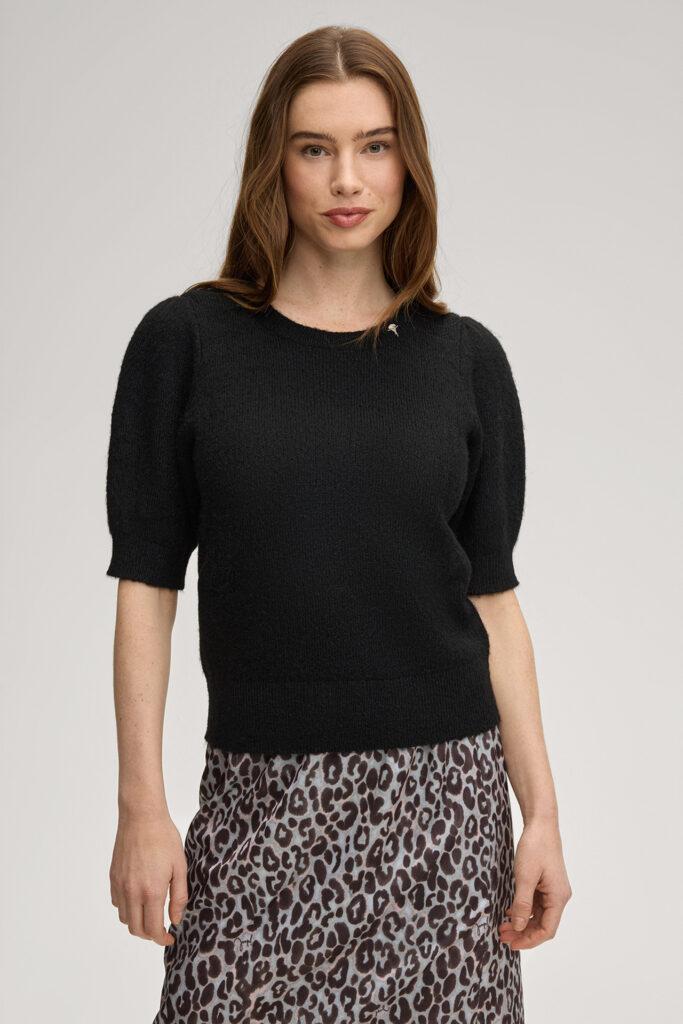 Vācu modes zīmola Joop! adīts sieviešu džemperis melnā krāsā. Papildināts ar kuplām īsajām piedurknēm un rievotu apdari. Akcentēts ar smalkām ikoniskā zīmola logotipa detaļām.