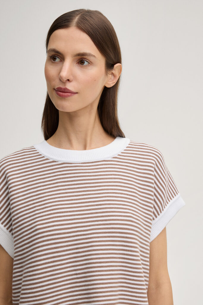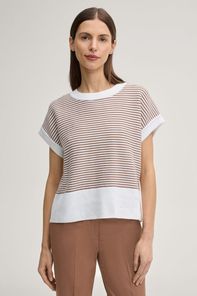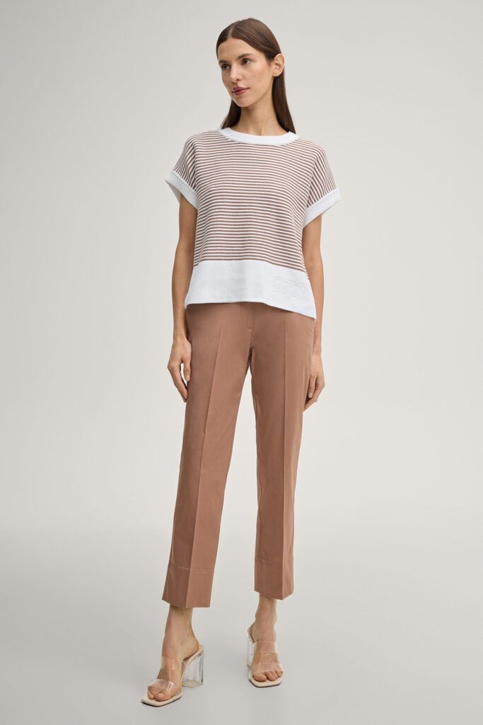 Vācu modes zīmola Joop! krēmbalts smalka adījuma sieviešu tops ar horizontālu svītriņu rakstu kanēļa brūnā krāsā. Izgatavots no 100% organiskās kokvilnas. Papildināts ar smalki rievotu apdari un zīmola logotipa reljefu apakšmalā.