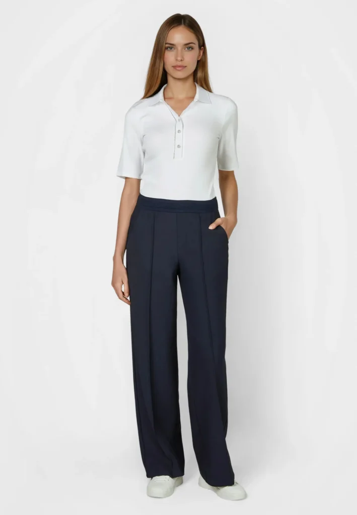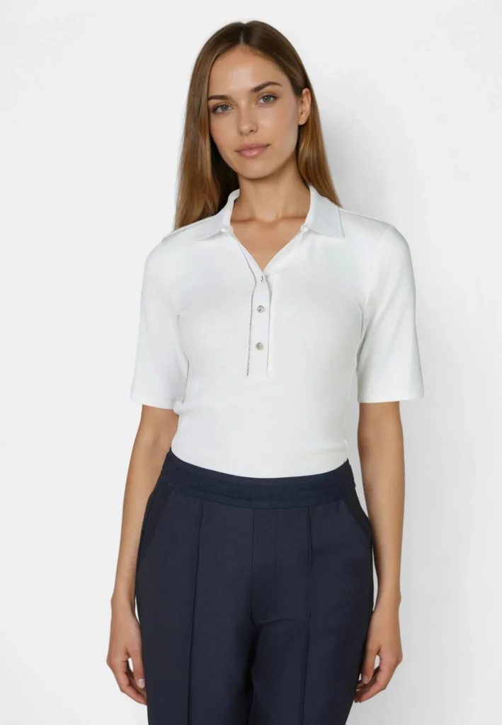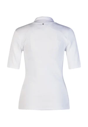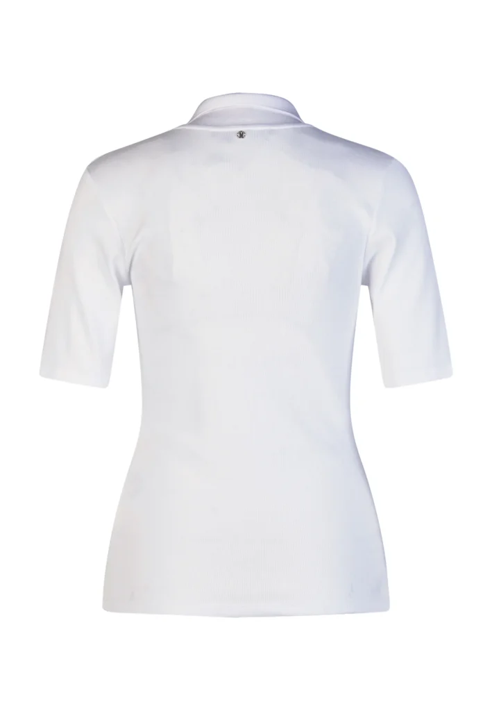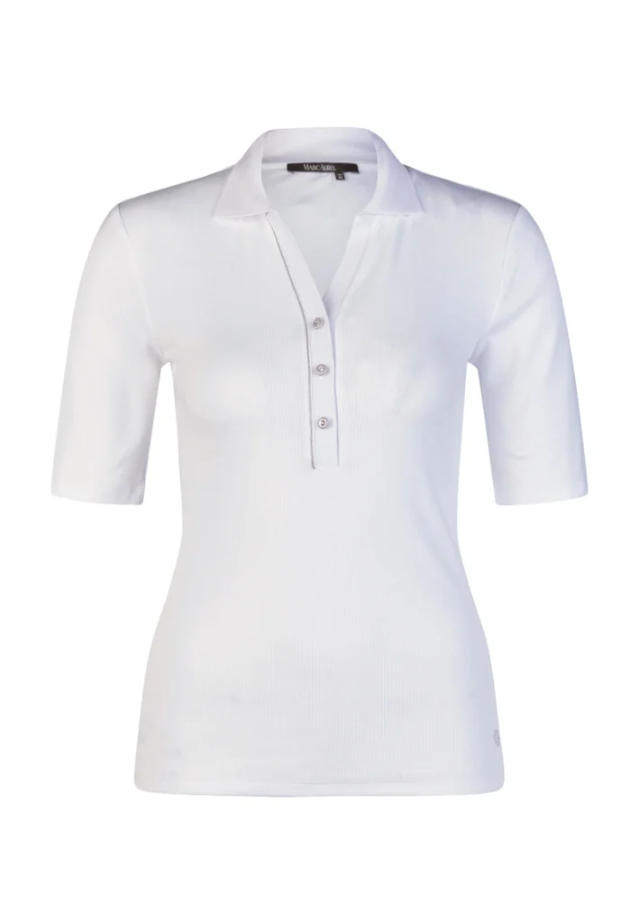 Vācu modes zīmola Marc Aurel viegli pieguļošs sieviešu polo krekls baltā krāsā ar mirdzošu pogu aizdari un apdari. Izgatavots no elastīga kokvilnas un modāla materiāla ar sīki rievotu tekstūru. Rotāts ar mirdzošu sirdsveida logotipu apakšmalā un smalku zīmola akcentu pie apkakles mugurpusē.