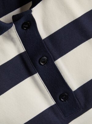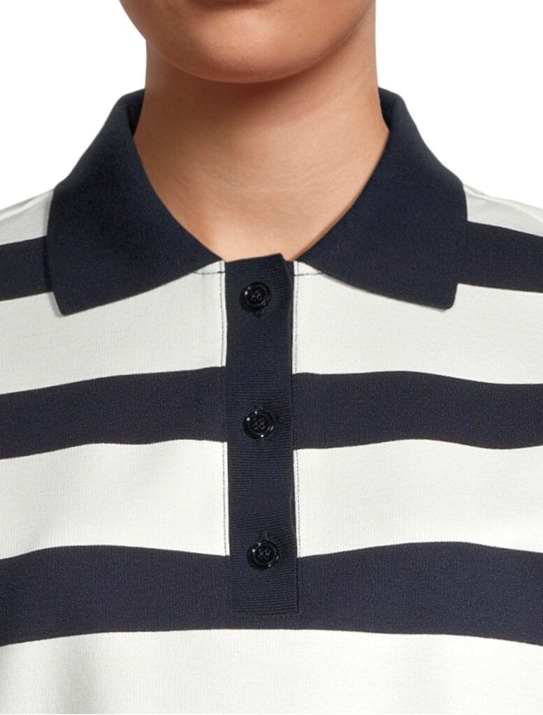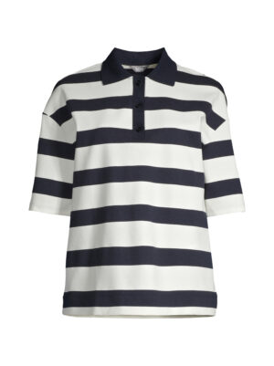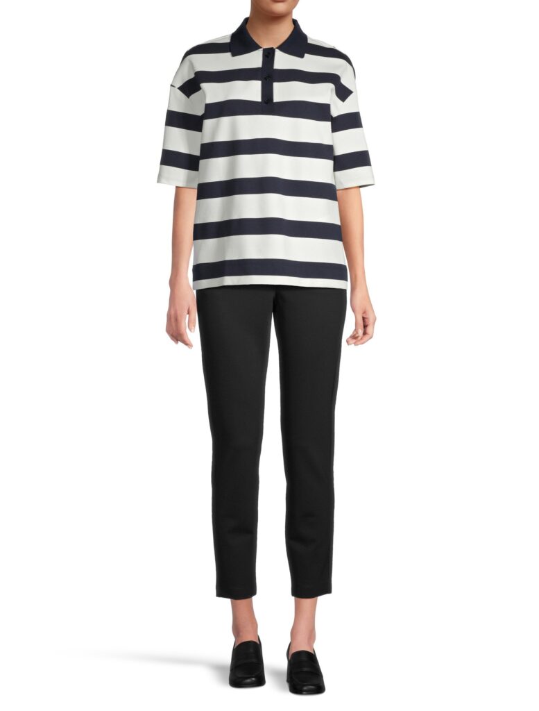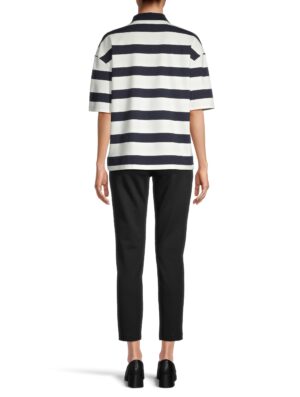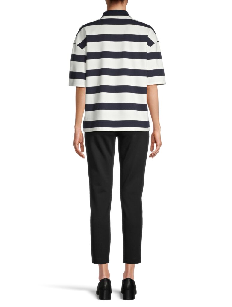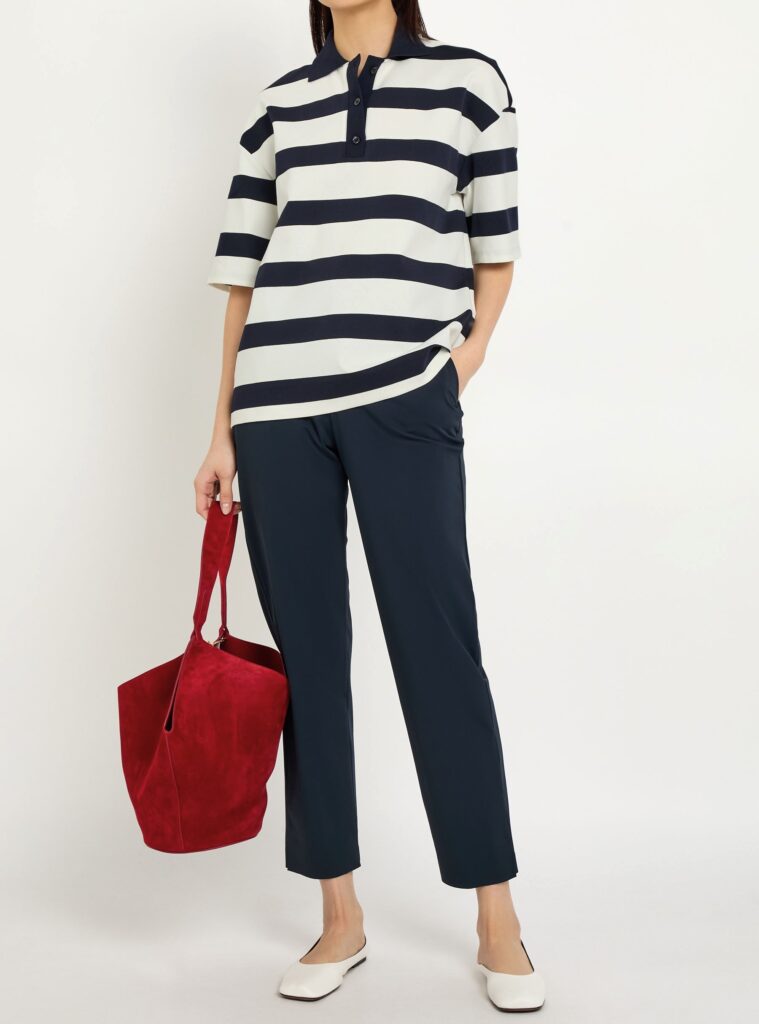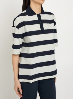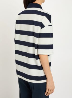 Itāļu modes zīmola MM by Max Mara sieviešu polo stila krekls ar kontrastējošu joslu rakstu gandrīz baltā un tumši zilā krāsā. Izgatavots no elastīga viskozes maisījuma materiāla. Papildināts ar pusgarām piedurknēm, kā arī smalki rievotu polo apkakli un pogu aizdari.