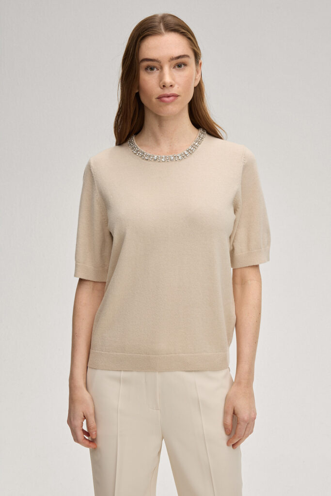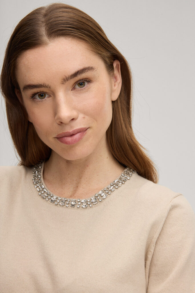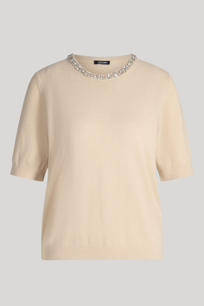 Vācu modes zīmola Joop! krēmīgi bēšs smalka adījuma sieviešu džemperis ar mirdzošo kristālu apdari apkaklē. Izgatavots no mīksta un viegla viskozes, vilnas un kašmira maisījuma materiāla. Papildināts ar smalki rievotu apdari un zīmola logotipa akcentu pie apkakles mugurpusē.