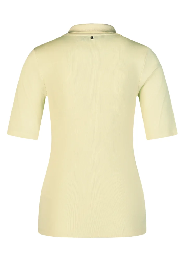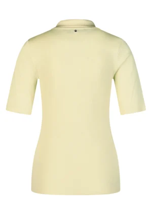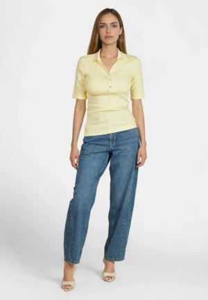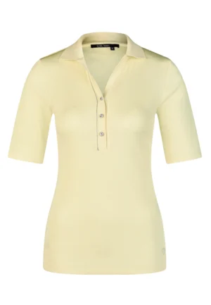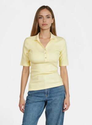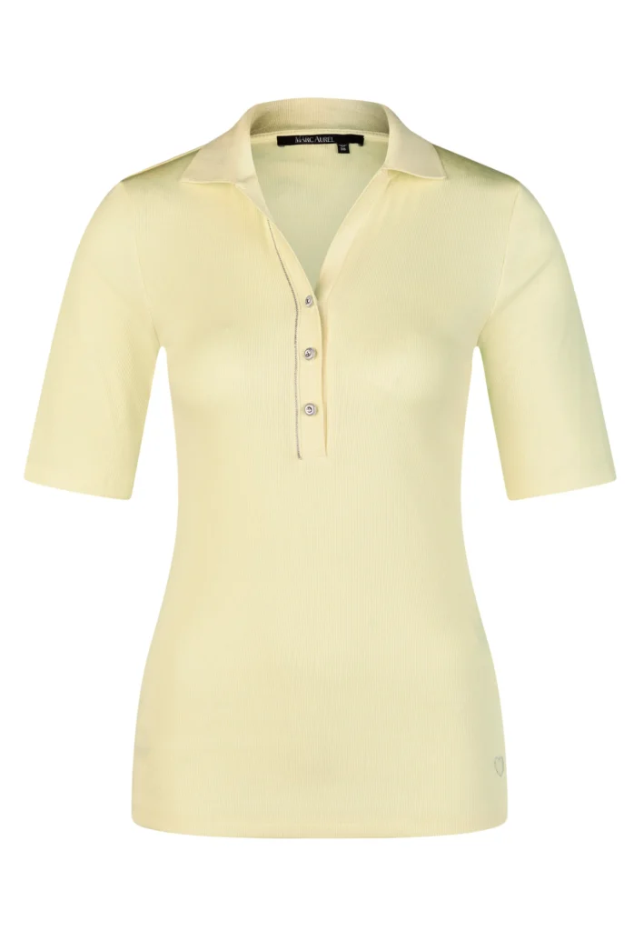 Vācu modes zīmola Marc Aurel viegli pieguļošs sieviešu polo krekls gaiši dzeltenā krāsā ar mirdzošu pogu aizdari un apdari. Izgatavots no elastīga kokvilnas un modāla materiāla ar sīki rievotu tekstūru. Rotāts ar mirdzošu sirdsveida logotipu apakšmalā un smalku zīmola akcentu pie apkakles mugurpusē.