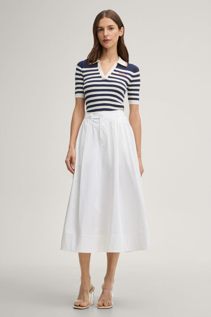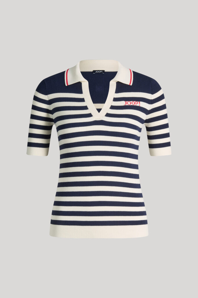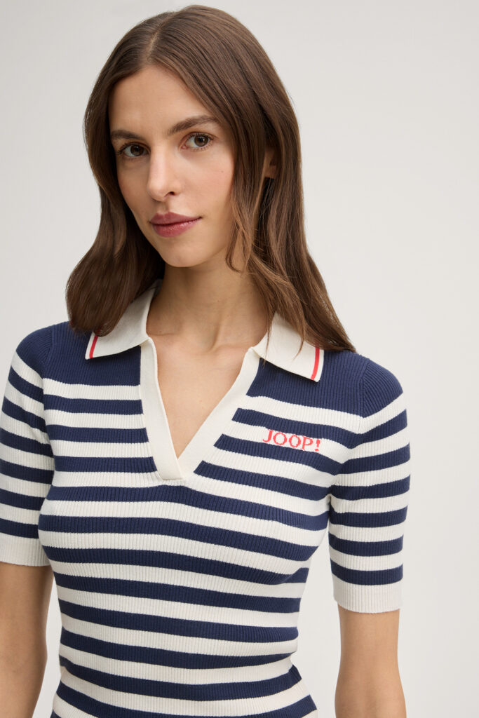 Vācu modes zīmola Joop! krēmbalts pieguļoša piegriezuma polo krekls ar tumši zilu horizontālo svītru rakstu un V veida kakla izgriezumu. Izgatavots no smalki rievota viskozes maisījuma materiāla. Akcentēts ar sārtu zīmola logotipu un apkakles apdari.