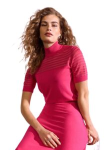 Vācu modes zīmola Riani smalka adījuma sieviešu tops ar augstu, atlokāmu apkakli un īsām piedurknēm maigā, krēmīgi bēšā tonī.