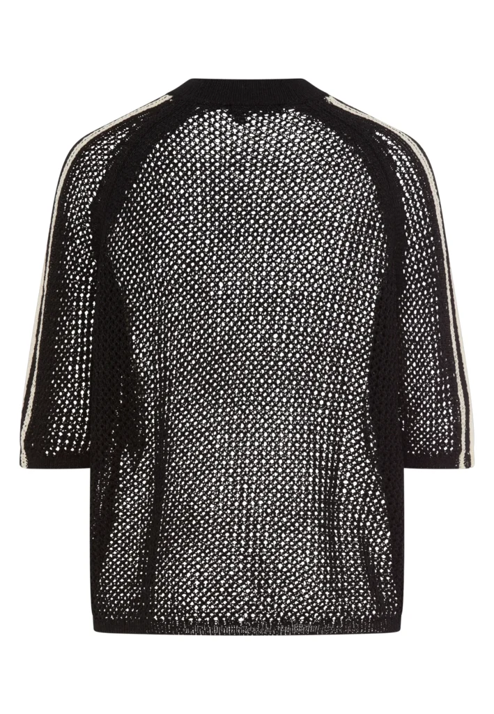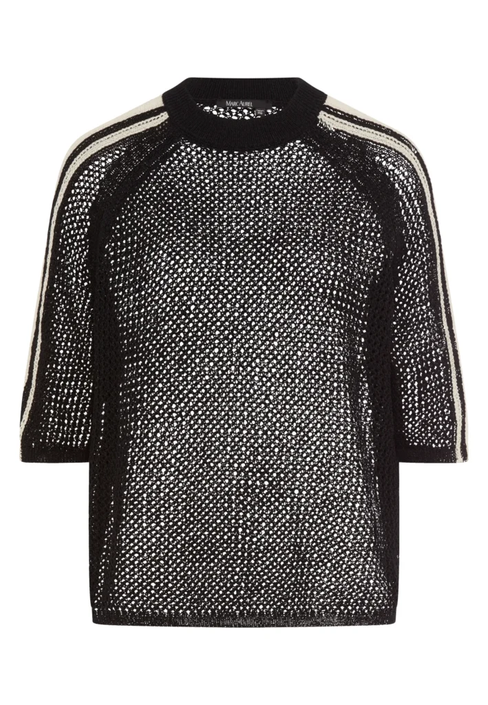 Vācu modes zīmola Marc Aurel melns sieviešu džemperis ar pusgarām reglāna piedurknēm. Izgatavots no kokvilnas maisījuma dzijas gaisīgā tīklveida adījuma rakstā. Akcentēts ar gaiši bēšām svītrām plecu un piedurkņu daļā.