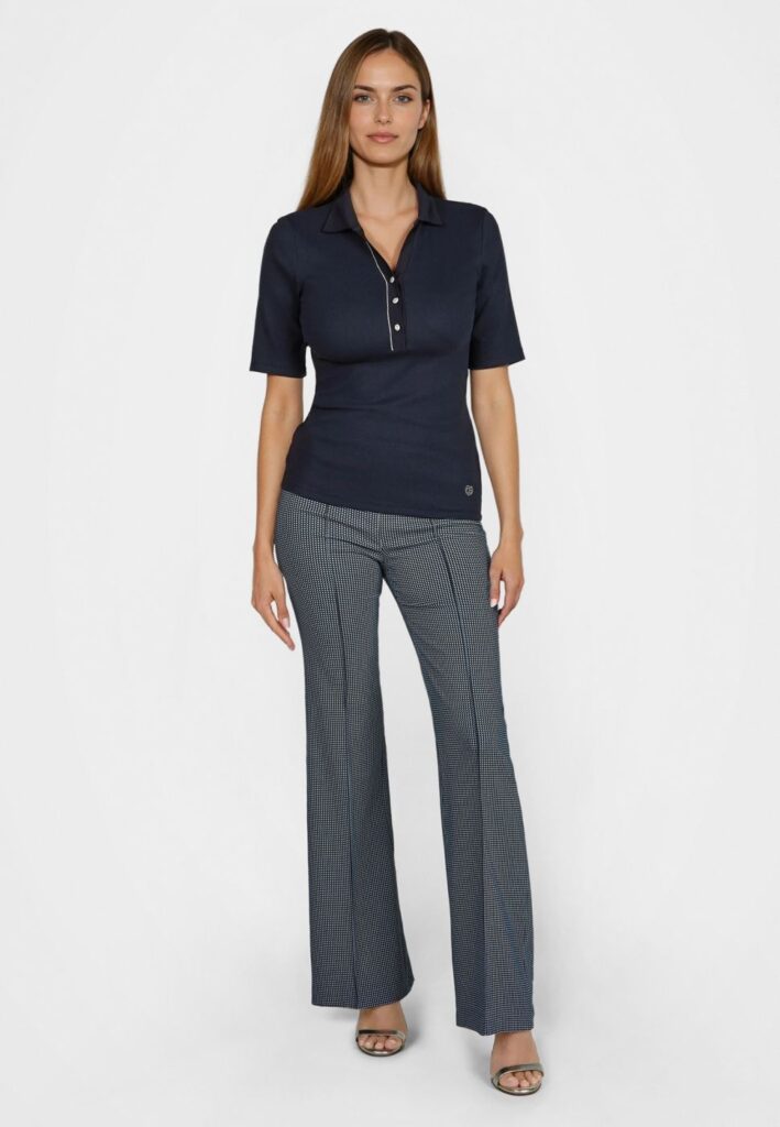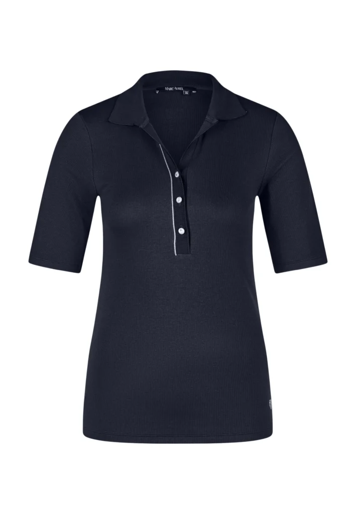 Vācu modes zīmola Marc Aurel viegli pieguļošs sieviešu polo krekls tumši zilā krāsā ar mirdzošu pogu aizdari un apdari. Izgatavots no elastīga kokvilnas un modāla materiāla ar sīki rievotu tekstūru. Rotāts ar mirdzošu sirdsveida logotipu apakšmalā un smalku zīmola akcentu pie apkakles mugurpusē.